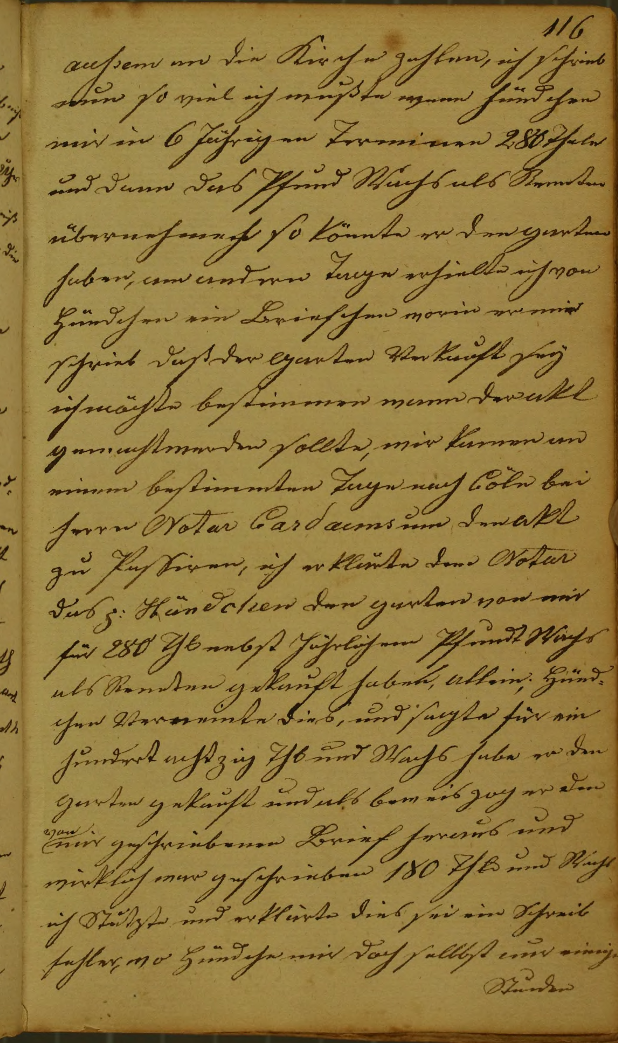 an die Kirche zahlen, ich schrieb nun so viel ich wußte wenn Hündchen mir in 6 Jährigen Terminen 280 Thaler und dann das Pfund Wachs als Rennten übernehmeh so könnte er den garten haben, am andern Tage erhielte ich von Hündchen ein Briefchen worin er mir schrieb daß der Garten Verkauft sey ich möchte bestimmen wann der akt gemacht werden sollte, wir kamen an einem bestimmten Tage nach Cöln bei herrn Notar Cardauns um den akt zu Passiren, ich erklärte dem Notar das p: Hündchen den garten von mir für 280 Thlr nebst Jährlichem Pfundt Wachs als Rennten gekauft haben, allein, Hündchen Verneinte dies, und sagte für einhundert achtzig Thlr und Wachs habe er den Garten gekauft und als beweis zog er den von mir geschriebenen Brief heraus und wirklich war geschrieben 180 Thlr und Wachs