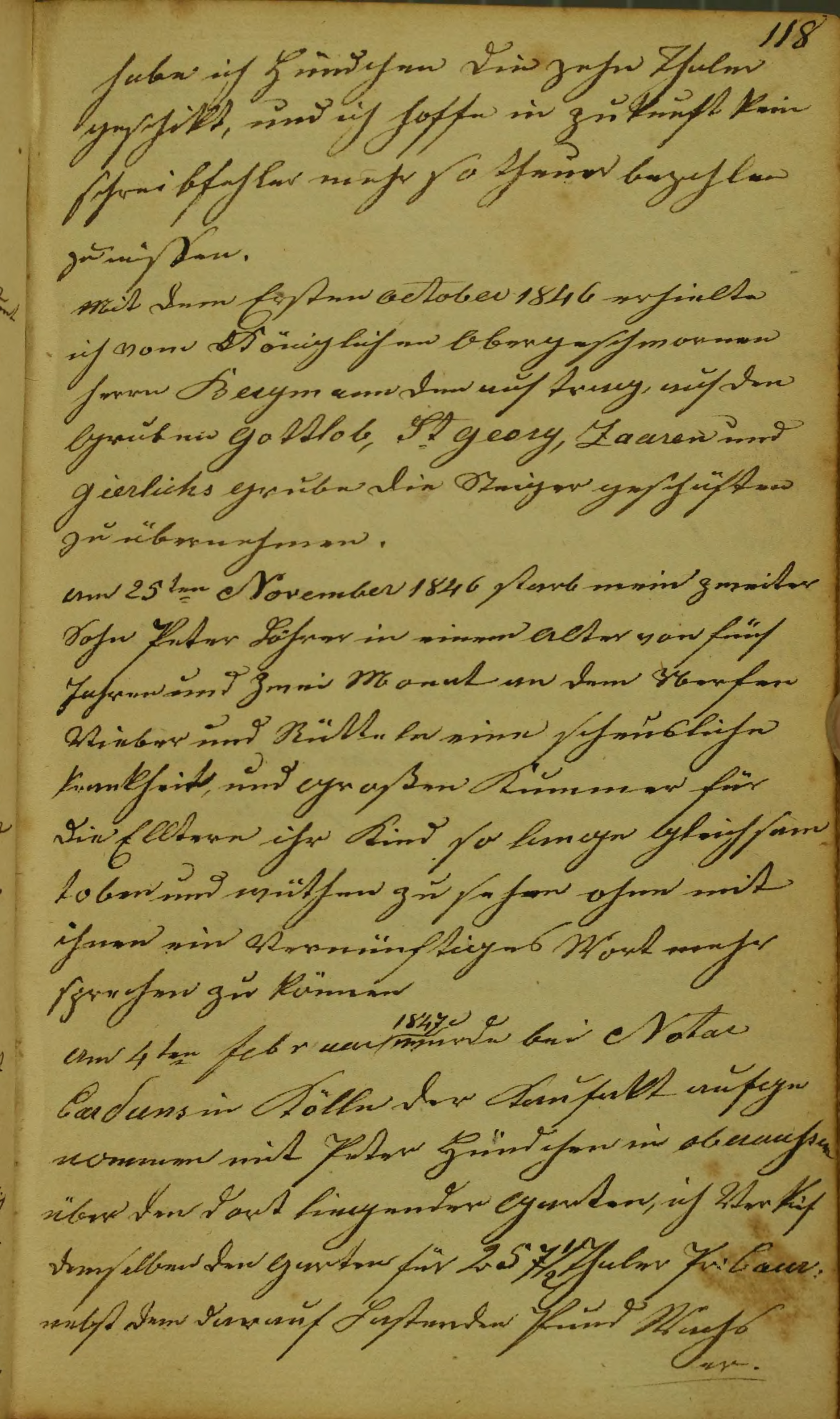 am 25ten November 1846 starb mein zweiter Sohn Peter Löhrer in einem Alter von fünf Jahren und Zwei Monat an dem Nerfen Vieber und Rütteln eine scheusliche Krankheit, und großen Kummer für die Elltern ihr Kind so lange gleichsam toben und wüthen zu sehen ohne mit ihnen ein Vernünftiges Wort mehr sprechen zu können.