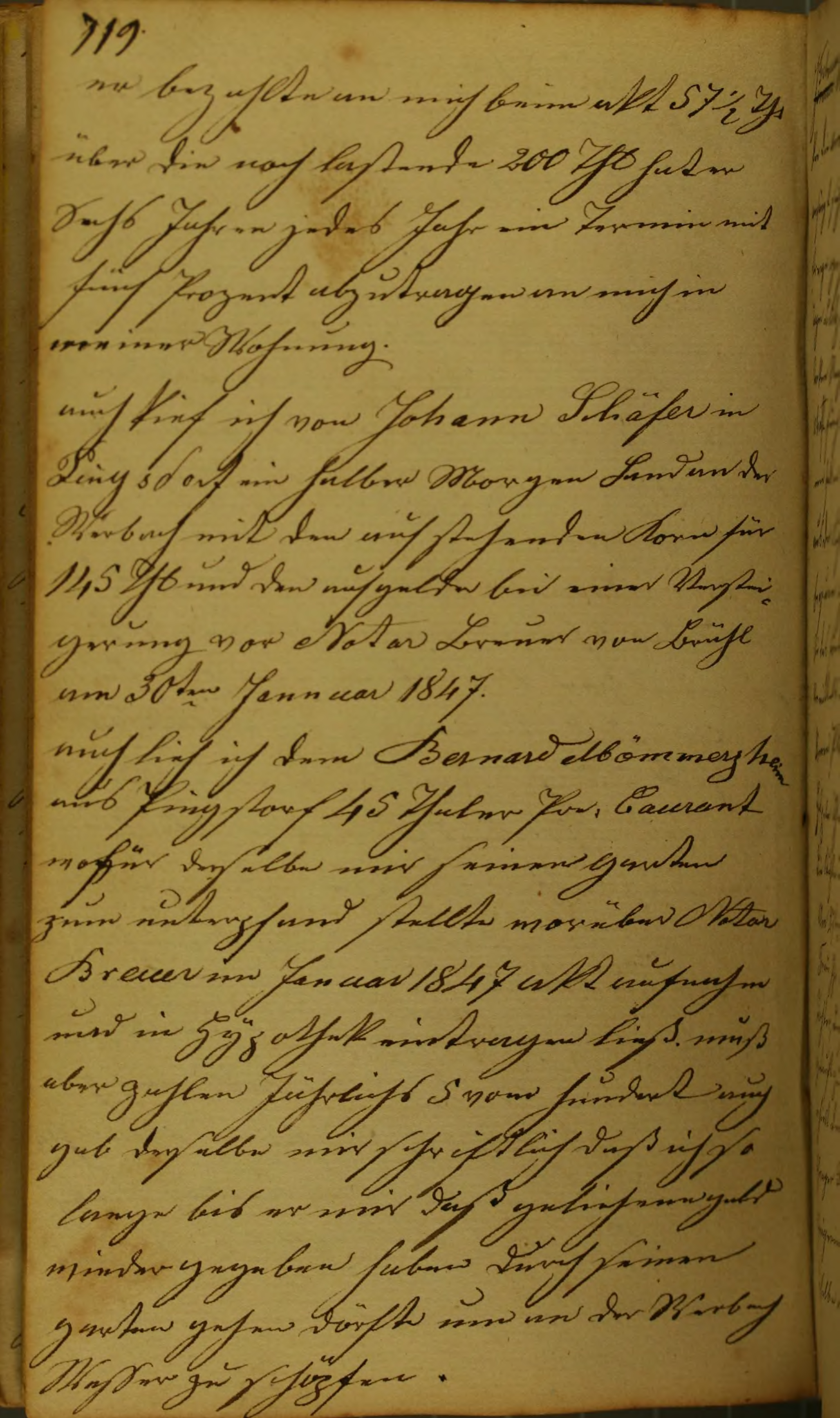 er bezahlte an mich beim akt 57½ Thlr über die noch lastenden 200 Thlr hat er Sechs Jahren jedes Jahr ein Termin mit fünf Prozent abzutragen an mich in meiner Wohnung.