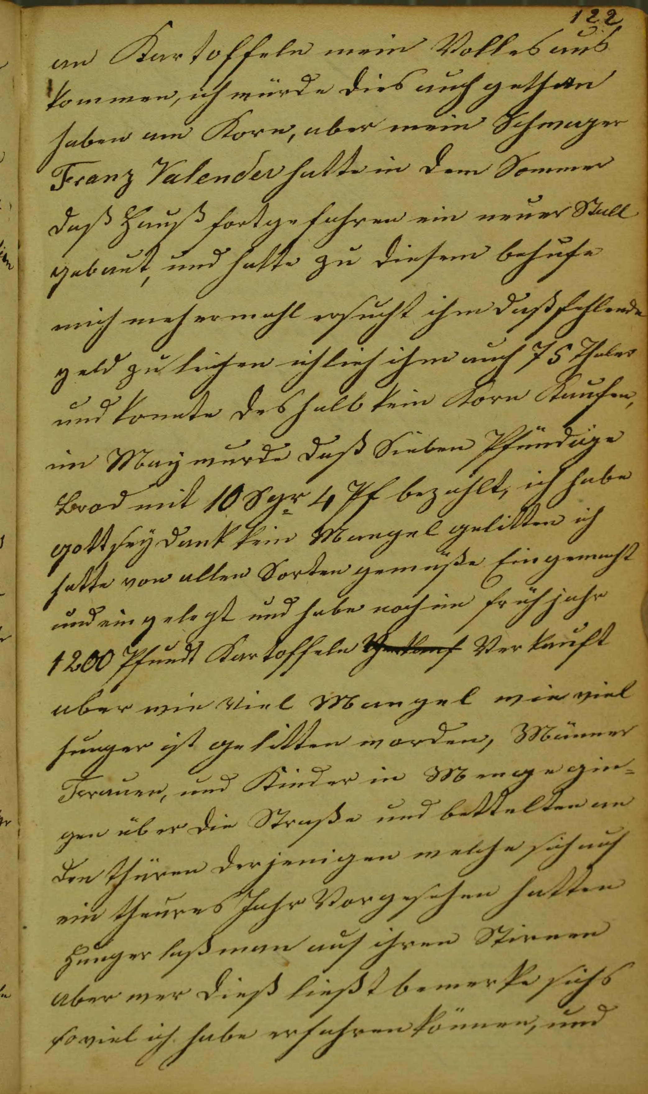 an Kartoffeln mein Volles auskommen, ich würde dies auch gethan haben am Korn, aber mein Schwager Franz Valender hatte in dem Sommer daß Hauß fortgefahren ein neuer Stall gebaut, und hatte zu diesem behufe mich mehermahl ersucht ihm daß fehlende geld zu leihen ich lieh ihm auch 75 Thaler und konnte deshalb kein Korn Kaufen, im May wurde daß Sieben Pfündige Brod mit 10 Sgr 4 Pf bezahlt, ich habe gottseydank kein Mangel gelitten ich hatte von allen Sorten gemüße Eingemacht und eingelegt und habe noch im frühjahr 1200 Pfundt Kartoffeln Gekauf Verkauft