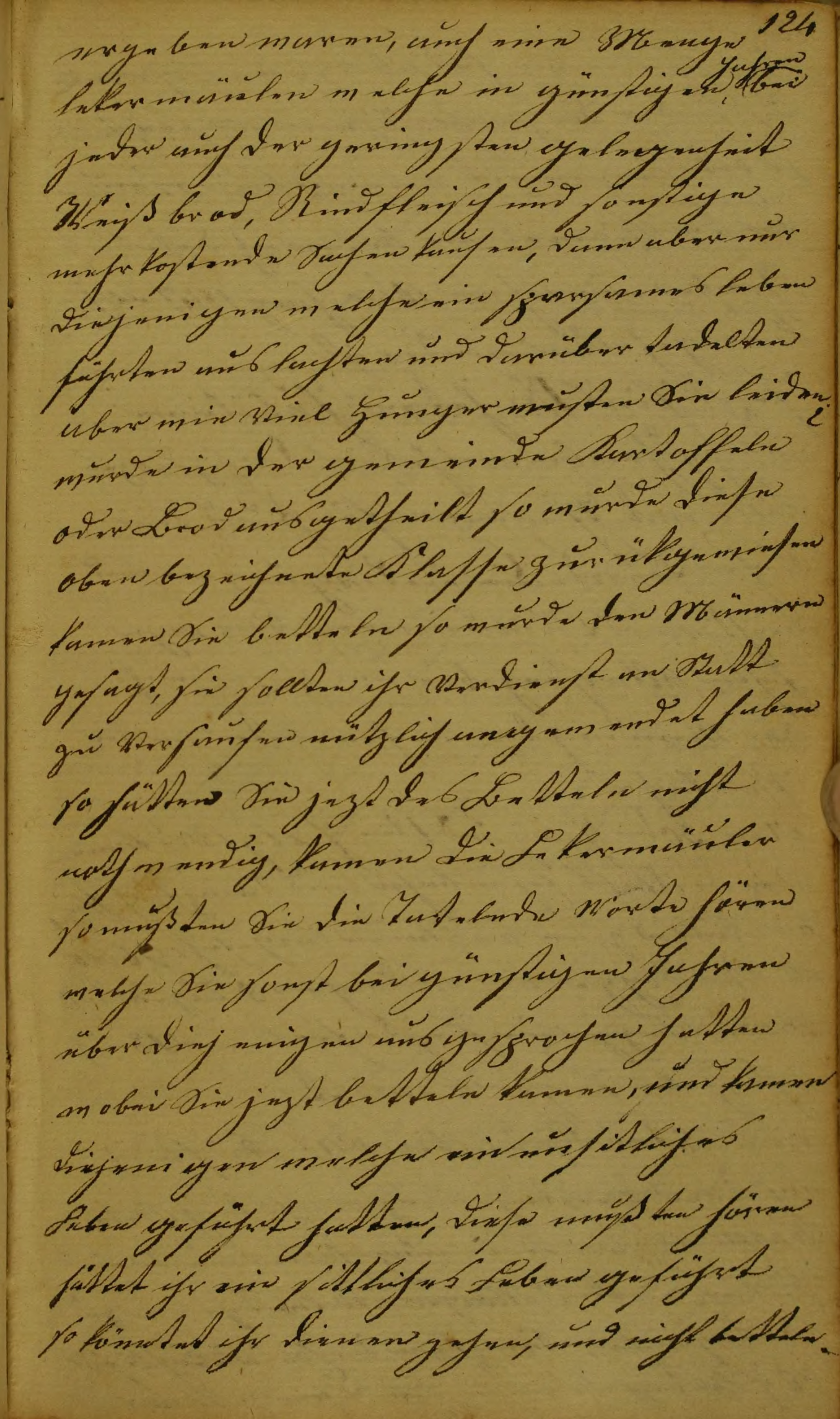 wurde in der gemeinde Kartoffeln oder Brod ausgetheilt so wurde diese oben bezeichnete Klasse zurückgewiesen kamen Sie betteln so wurde den Männern gesagt, sie sollten ihr Verdienst an Statt zu Versaufen nützlich angewendet haben so hätten Sie jezt des Betteln nicht nothwendig, kamen die Lekermäuler so mußten Sie die Tatelnde Worte hören welche Sie sonst bei günstigen Jahren über diejenigen ausgesprochen hatten wobei Sie jezt betteln kamen, und kamen diejenigen welche ein unsitliches Leben geführt hatten, diese mußten hören hättet ihr ein sittliches Leben geführt so könntet ihr dienen gehen, und nicht betteln.