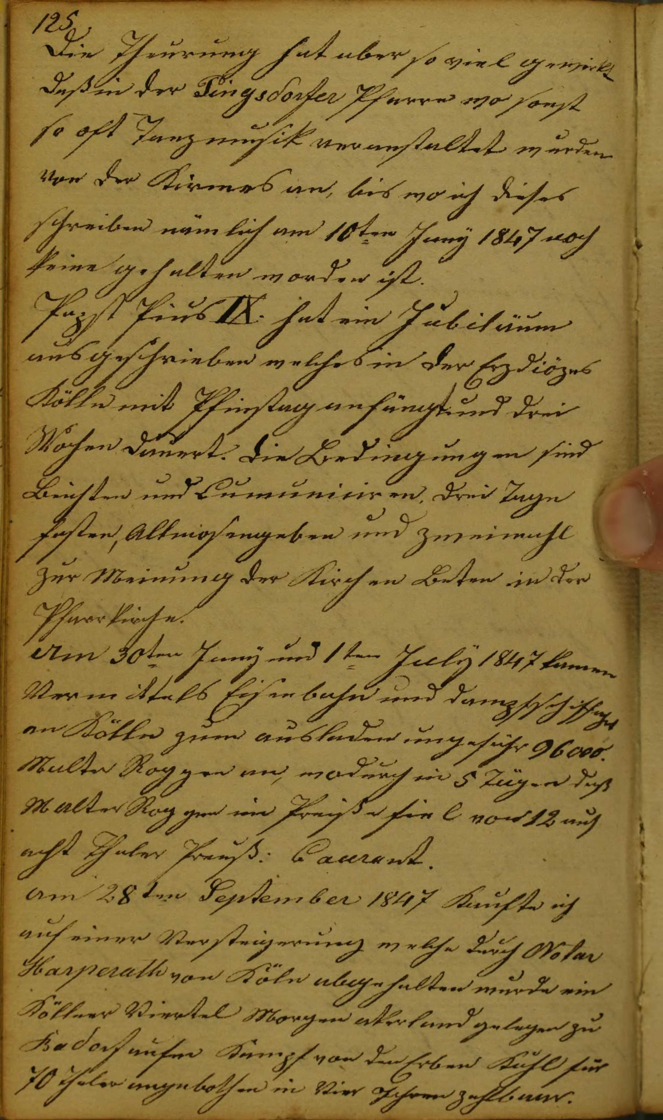 Am 30ten Juny und 1ten July 1847 kamen Vermittels Eisenbahn und dampfschiffahrt an Kölln zum ausladen ungefähr 96000. Malter Roggen an, wodurch in 5 Tägen daß Malter Roggen im Preiße fiel von 12 auf acht Thaler Preuß: Caurant.