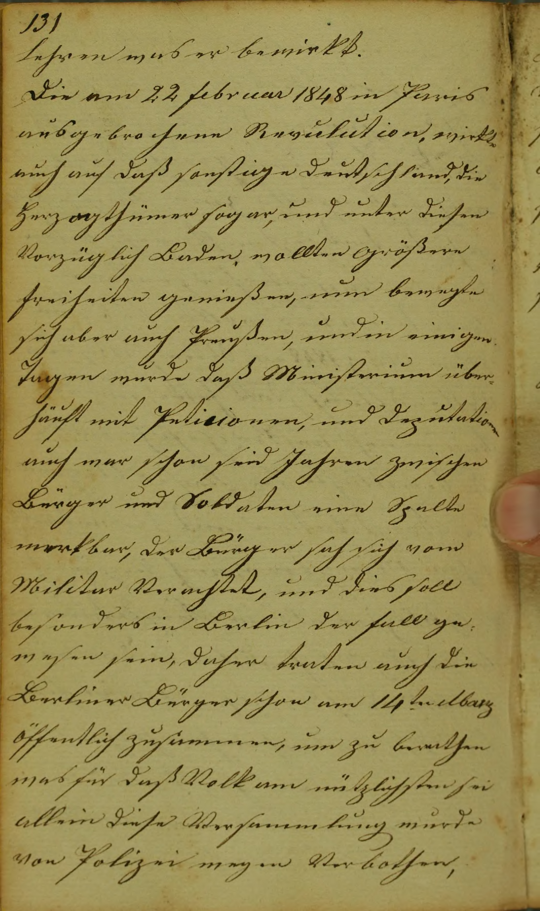 die am 22 februar 1848 in Paris ausgebrochene Revulution, wirkte auch auf daß sonstige deutschland, die Herzogthümer sogar, und unter diesen Vorzüglich Baden, wollten größere freiheiten genießen, nun bewegte sich aber auch Preußen, und in einigen Tagen wurde daß Ministerium überhäuft mit Peticionen, und deputationen auch war schon seid Jahren zwischen Bürger und Soldaten eine Spalte merkbar, der Bürger sah sich vom Militar Verachtet, und dies soll besonders in Berlin der fall gewesen sein, daher traten auch die Berliner Bürger schon am 14ten Marz öffentlich zusammen, um zu berathen was für daß Volk am nützlichsten sei allein diese Versammlung wurde von Polizei wegen Verbothen,