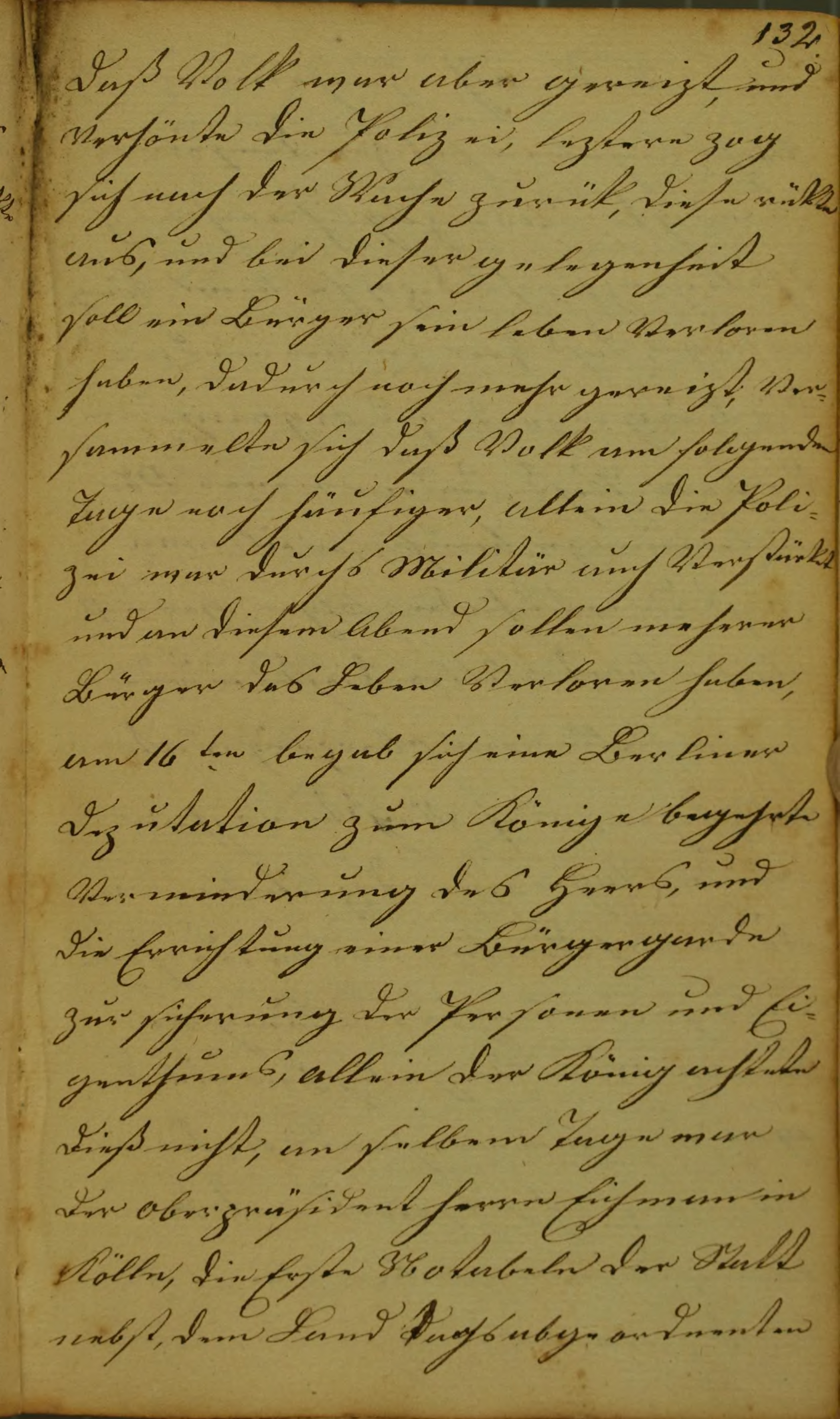 daß Volk war aber gereizt, und verhönte die Polizei, leztere zog sich nach der Wache zurük, diese rükte aus, und bei dieser gelegenheit soll ein Bürger sein leben Verloren haben, dadurch noch mehr gereizt, Versammelte sich daß Volk am folgenden Tage noch häufiger, allein die Polizei war durchs Militär auch Verstärkt und an diesem Abend sollen meherer Bürger das Leben Verloren haben, am 16ten begab sich eine Berliner deputation zum Könige begehrte Verminderung des Heers, und die Errichtung einer Bürgergarde zur sicherung der Personen und Eigenthums, allein der König achtete dieß nicht, an selbem Tage war der Oberpräsident herrn Eichman in Kölln, die Erste Notabeln der Statt nebst, dem Land tagsabgeordneten