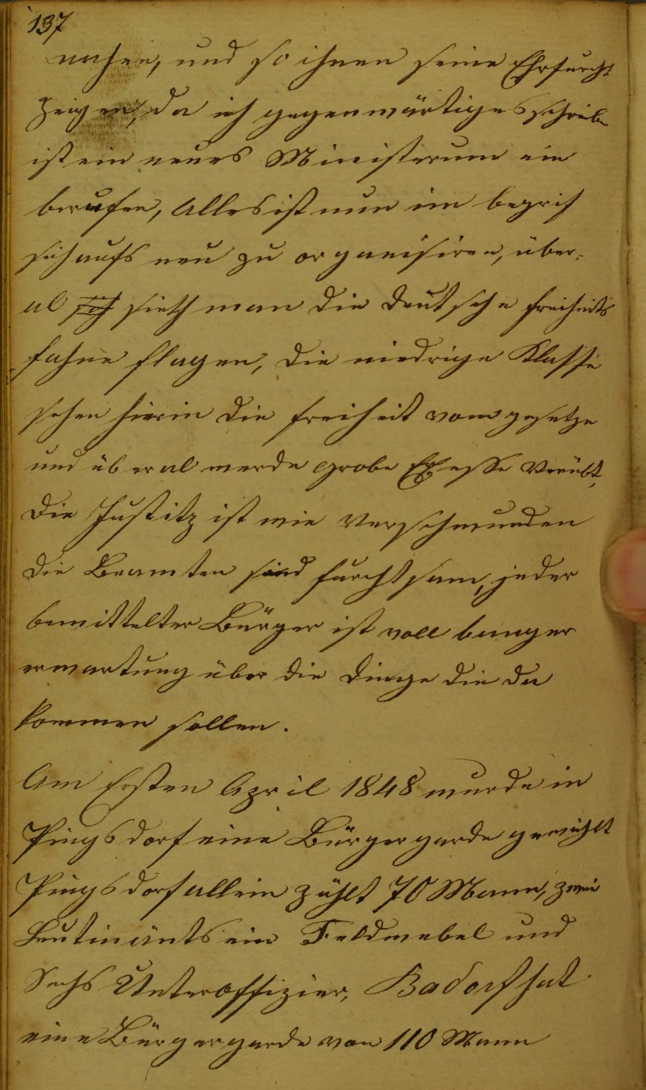 nahen, und so ihnen seine Ehrfurcht zeigen, da ich gegenwärtiges schreibe ist ein neues Ministerum einberufen, Alles ist nun im begrif sich aufs neu zu organisiren, überal sih sieth man die deutsche freiheitsfahne flagen, die niedrige Klasse sehen hierin die freiheit vom gesetze und überal werde grobe Exesse Verübt, die Justitz ist wie verschwunden die Beamten sind furchtsam, jeder bemittelter Bürger ist voll banger erwartung über die dinge die da kommen sollen.
