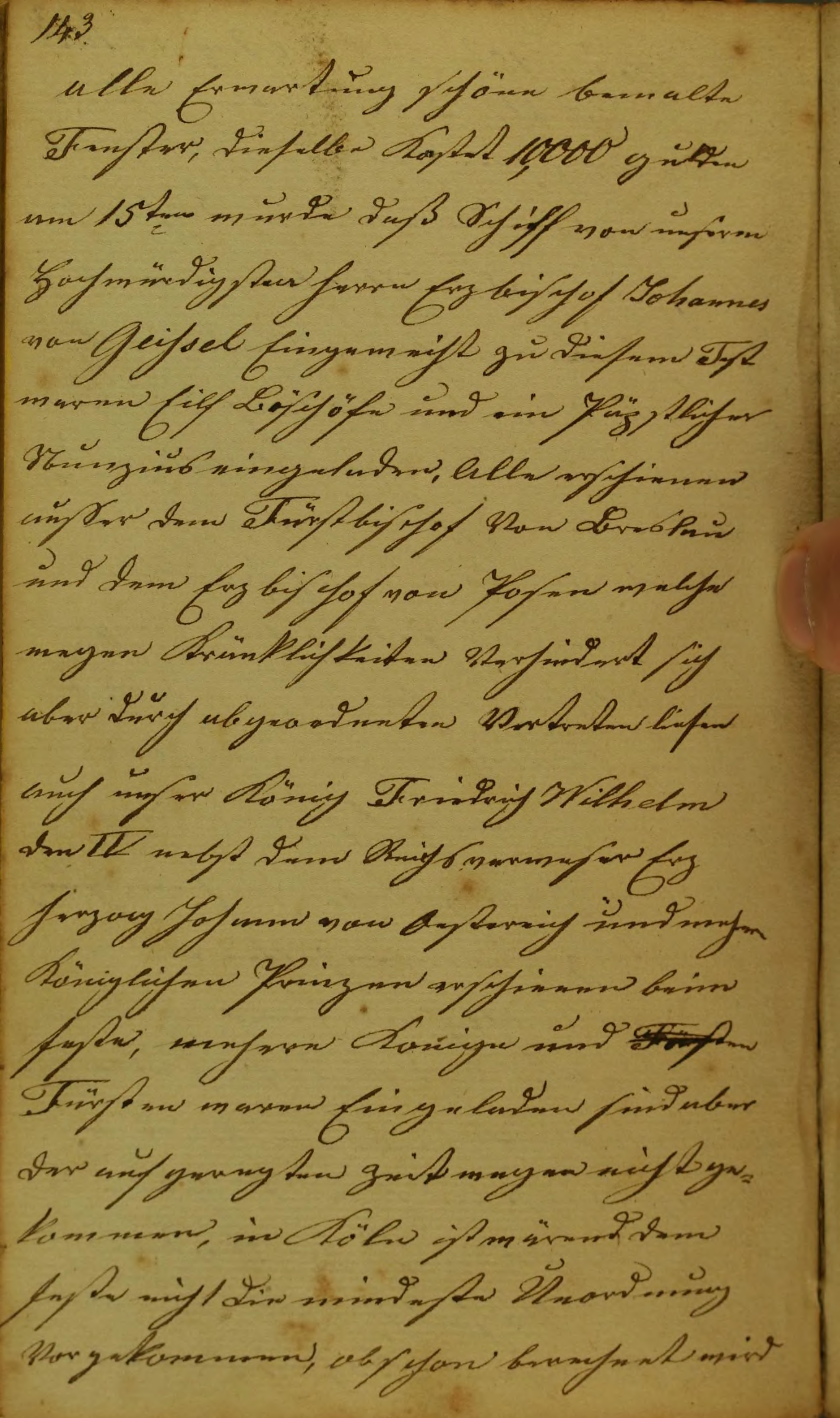 am 15ten wurde daß Schiff von unserm Hochwürdigsten herrn Erzbischof Johannes von Geissel Eingeweiht zu diesem Fest waren Eilf Bischöfe und ein Päpstilcher Nunzius eingeladen, Alle erschienen ausser dem Fürstbischof Von Breslau und dem Erzbischof von Posen welche wegen Kränklichkeiten Verhindert sich aber durch abgeordneten Vertreten liesen