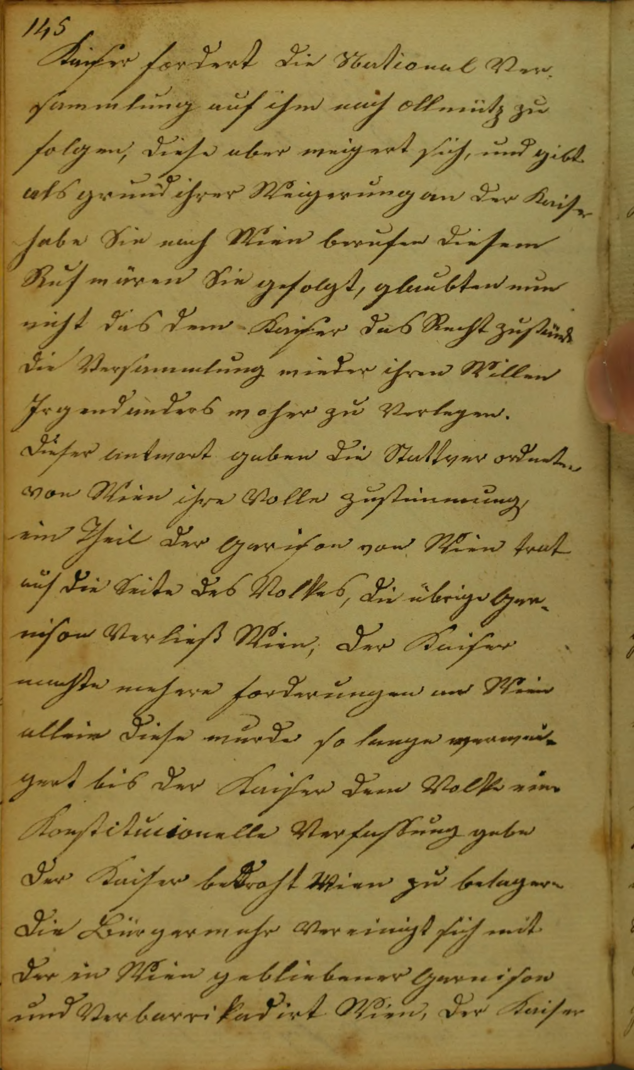Dieser Antwort gaben die Stattverordneten von Wien ihre Volle Zustimmung, ein Theil der Garison von Wien trat auf die Seite des Volkes, die übrige Garnison Verließ Wien, der Kaiser machte mehere forderungen an Wien allein diese wurde so lange verweigert bis der Kaiser dem Volk eine Konstitucionelle Verfassung gebe