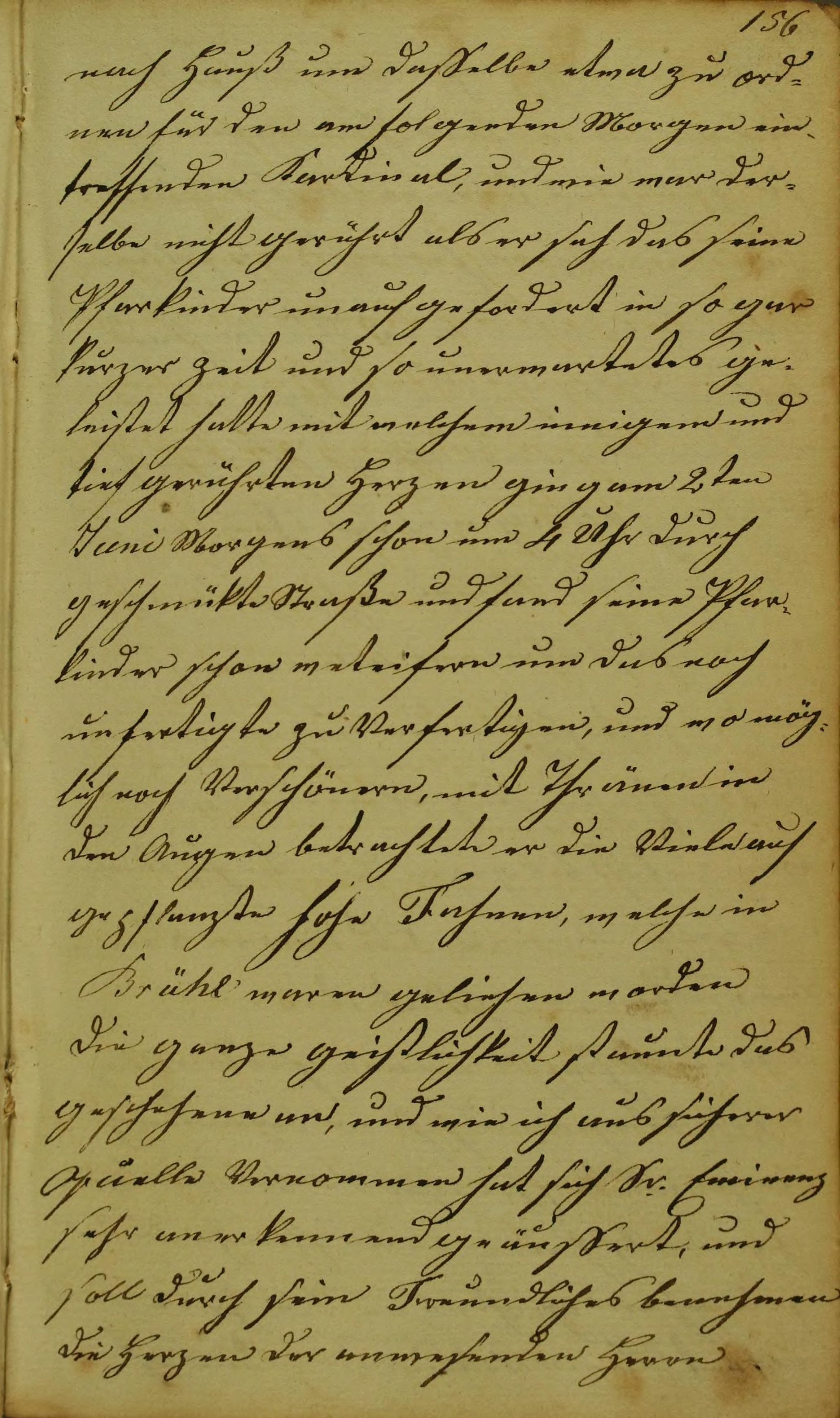nach Hauß um daselbe etwa zu ordnen für den am folgenden Morgen eintreffenden Kardinal, und wie war derselbe nicht gerührt als er sah das seine Pfarkinder unaufgefordert in so gar kurzer Zeit und so unerwartetes geleistet hatte mit welchem innigem und tief gerührten Herzen ging am 2ten Juni Morgens schon um 4 Uhr durch geschmükte Straße und fand seine Pfarkinder schon weteifern um das noch unfertigte zu Verfertigen, und wo möglich noch Verschönern, mit Thränen in den Augen betrachtete er die Viele aufgepflanzte hohe Fahnen, welche in Brühl waren geliehen worden die ganze Geistlichkeit staunte das Geschehene an, und wie ich aus sicherer Quelle Vernommen hat sich Sr Eminenz sehr anerkennend geäußert, und soll durch sein Freundliches benehmen die Herzen der anwesenden Herrn