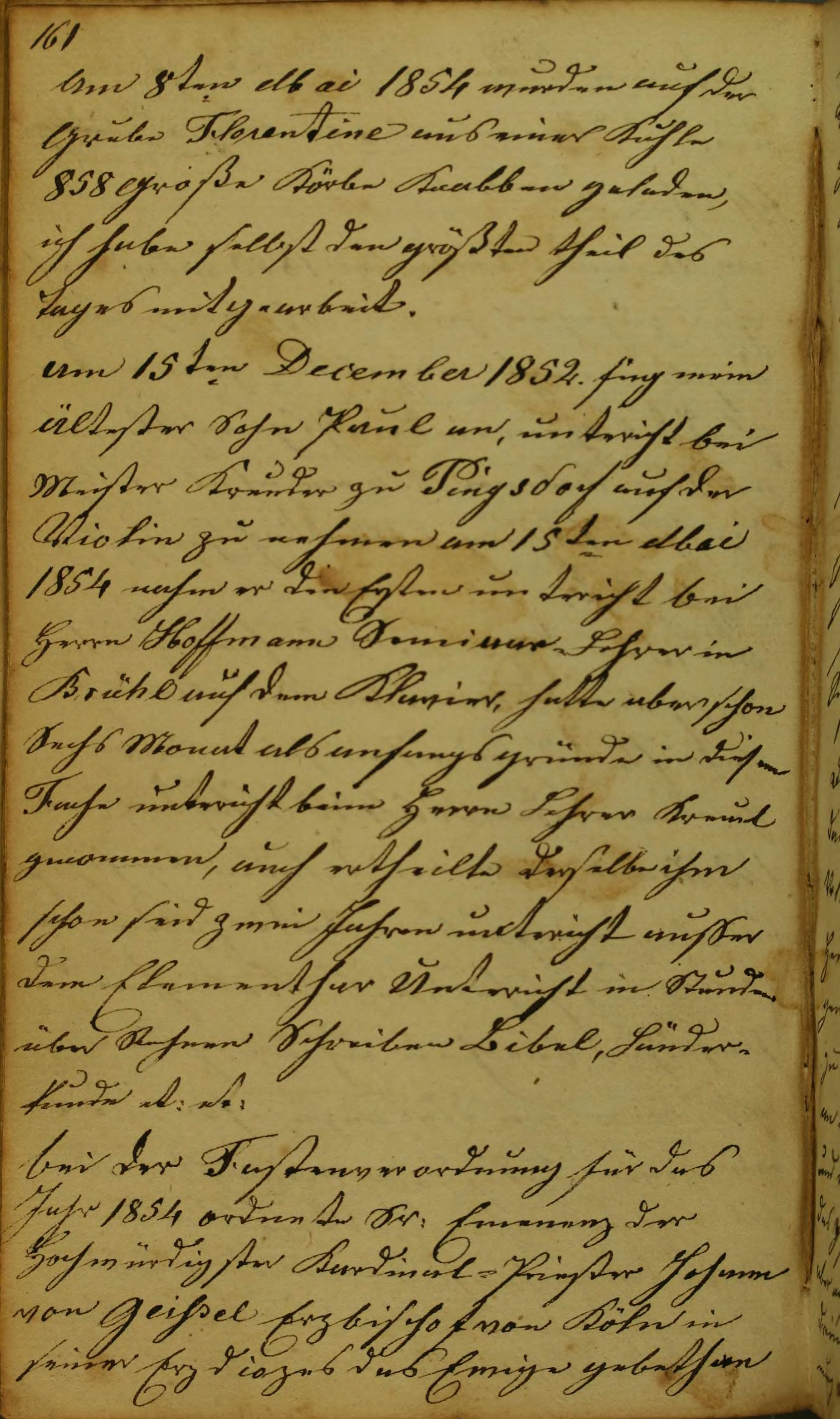Am 15ten December 1852. fing mein Ältester Sohn Paul an, untericht bei Meister Kreuder zu Pingsdorf auf der Violin zu nehmen am 15ten Mai 1854 nahm er den Ersten untericht bei Herrn Hoffmann Seminar Lehrer in Brühl auf dem Klavier, hatte aber schon Sechs Monat als anfangs gründe in diesem Fache untericht beim Herrn Lehrer Kreuel genommen, auch ertheilte derselbe ihm schon seid zwei Jahren untericht außer dem Elementhar Untericht in Stunden über Rechnen Schreiben, Bibel, Länderkunde et: et: