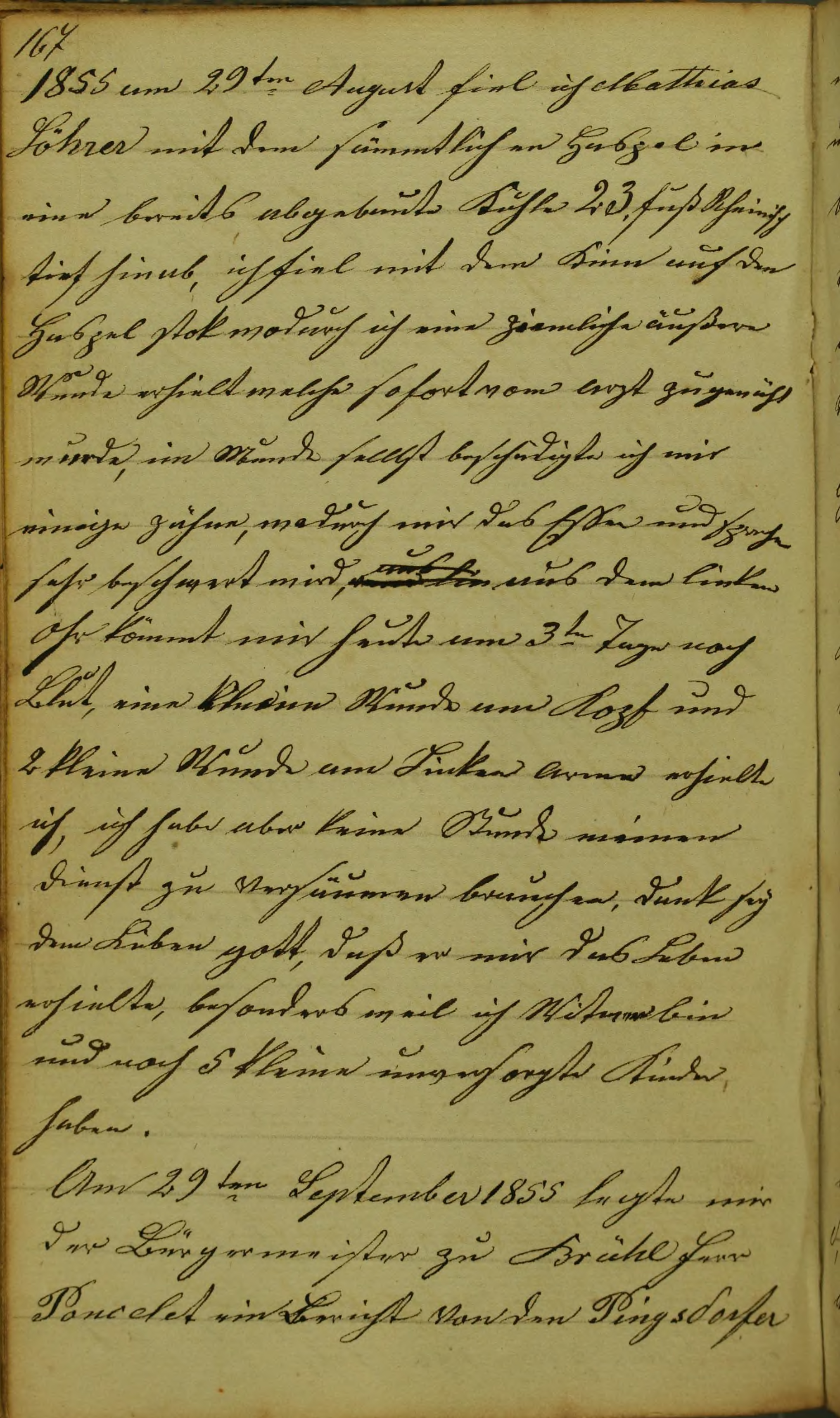 1855 am 29ten August fiel ich Mathias Löhrer mit dem sämmtlichen Haspel in eine bereits abgebaute Kuhle 23. fuß Rheinisch tief hinab, ich fiel mit dem Kinn auf den Haspelstok wodurch ich eine ziemlich äußere Wunde erhielt welche sofort vom Arzt zugenäht wurde im Munde selbst beschädigte ich mir einige Zähne, wodurch mir das Essen und Sprechen sehr beschwert wird aus vom lin aus dem linken Ohr kömmt mit heute am 3ten Tage noch Blut, eine kleine Wunde am Kopf und 2 kleine Wunde am Linken Arme erhielt ich, ich habe aber keine Stunde meinen Dienst zu versäumen brauchen, dank sey dem Lieben Gott, daß er mir das Leben erhielte, besonder weil ich Witwer bin und noch 5 kleine unversorgte Kinder haben.