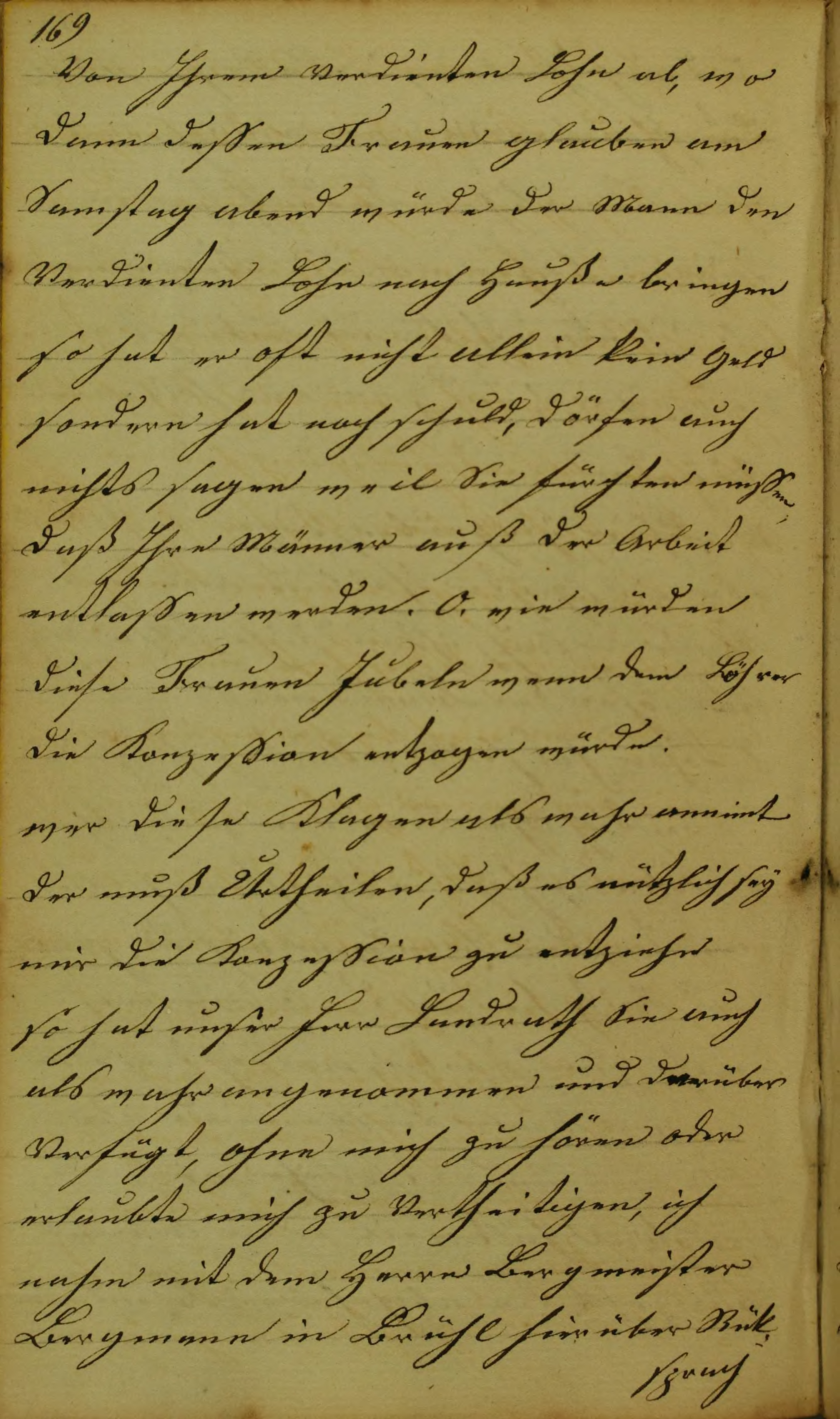 - von Ihrem verdienten Lohn ab, wo dann dessen Frauen glauben am Samstag Abend würde der Mann den Verdienten Lohn nach Hauße bringen so hat er oft nicht allein kein Geld sondern hat noch schuld, dörfen auch nichts sagen weil Sie fürchten müssen, daß Ihre Männer auß der Arbeit entlassen werden. O, wie würden diese Frauen Jubeln wenn dem Löhrer die Konzession entzogen würde.