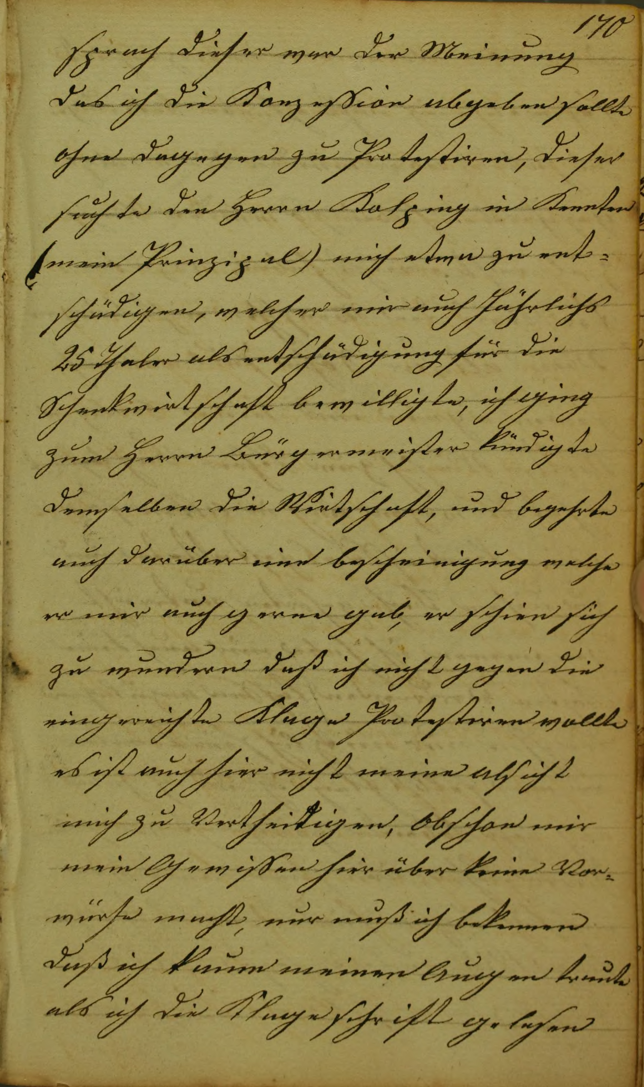 Dieser war der Meinung das ich die Konzession abgeben sollte ohne dagegen zu Protestiren, dieser suchte den Herrn Kolping in Kennten (mein Prinzipal) mich etwa zu entschädigen, welcher mir auch Jährlichs 25 Thaler als entschädigung für die Schenkwirtschaft bewilligte, ich ging zum Herrn Bürgermeister kündigte demselben die Wirtschaft und begehrte auch darüber eine bescheinigung welche er mir auch gerne gab, er schien sich zu wundern daß ich nicht gegen die eingereichte Klage Protestiren wollte es ist auch hier nicht meine absicht mich zu vertheidigen, obschon mir mein Gewissen hier über keine Vorwürfe macht, nur muß ich bekennen daß ich kaum meinen Augen traute als ich die Klageschrift gelesen