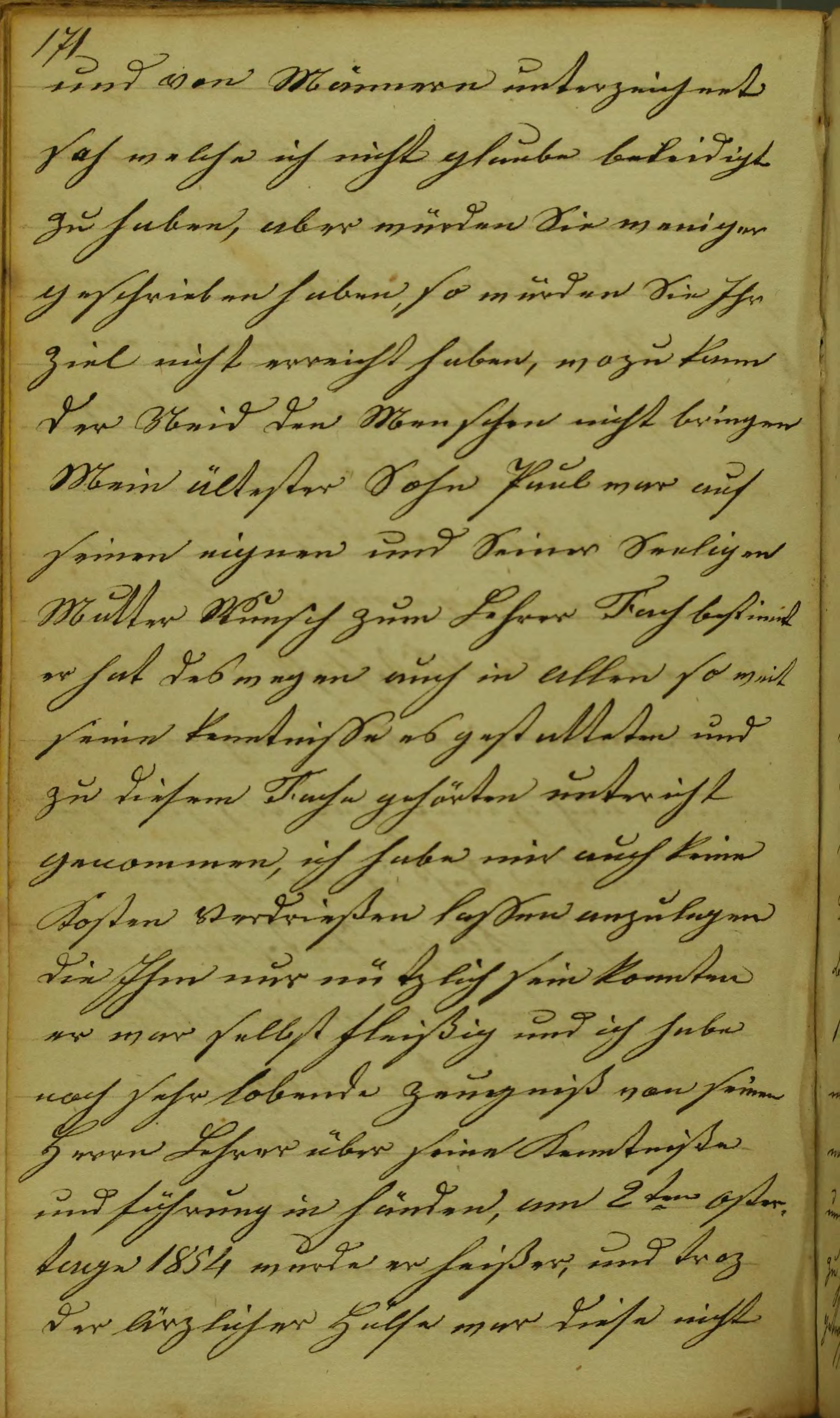 Mein ältester Sohn Paul war auf seinen eignen und Seiner Seeligen Mutter Wunsch zum Lehrer Fach bestimmt er hat deswegen auch in allen so weit seine Kenntnisse es gestatteten und zu diesem Fache gehörten untericht genommen, ich habe mir auch keine Kosten verdrießen lassen anzulegen die Ihm nur nützlich sein konnten er war selbst fleißig und ich habe noch sehr lobende Zeugniß von seinem Herrn Lehrer über seine Kenntniße und Führung in Händen, am 2ten Ostertage 1854 wurde er heißer, und troz der ärzlicher Hülfe war diese nicht