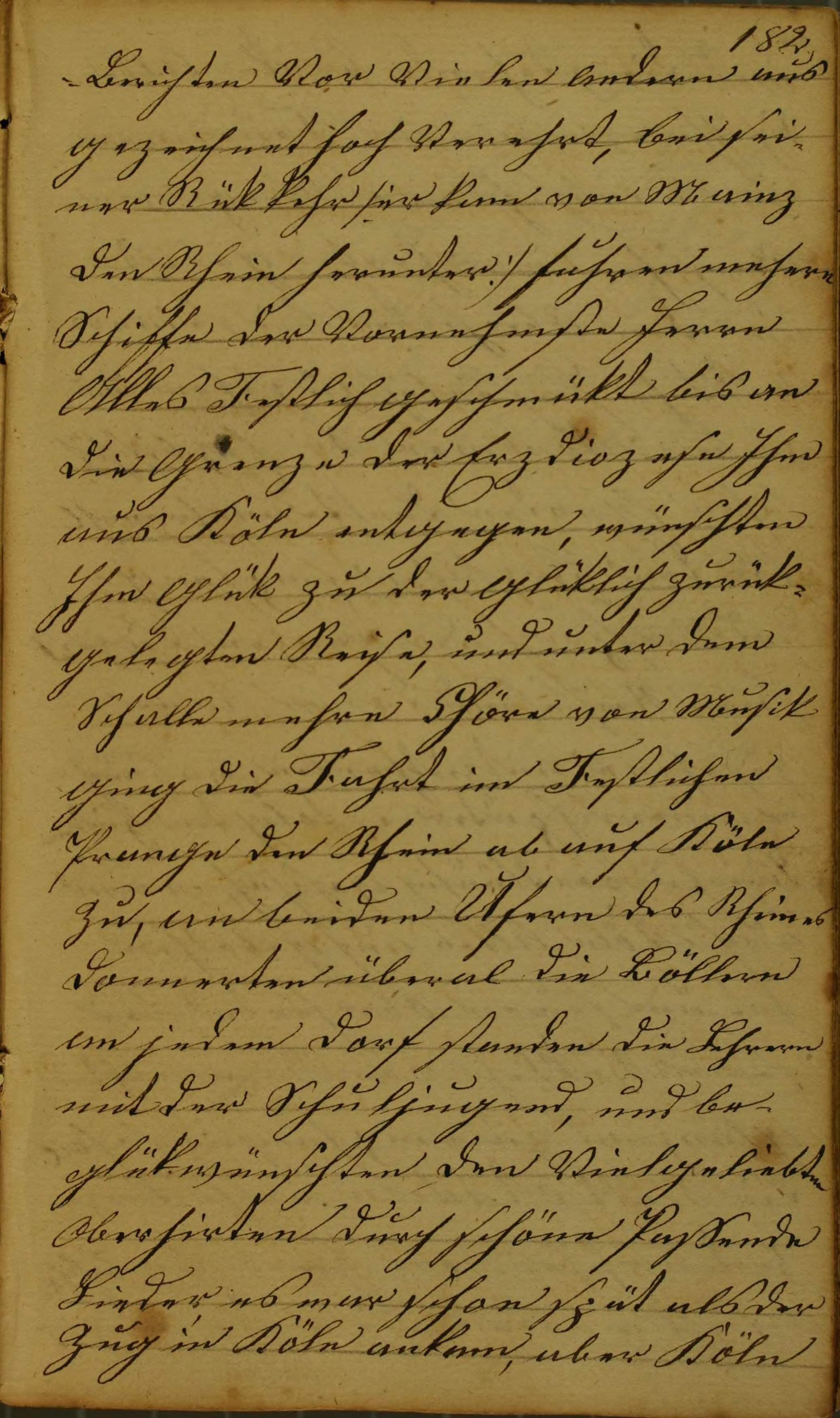 Berichten Vor Vielen Andern ausgezeichnet hoch Verehrt, bei seiner Rükkehr /: er kam von Mainz den Rhein herunter :/ fuhren mehere Schiffe der Vornehmste Herrn Alles Festlich geschmükt bis an die Grenze der Erzdiozese Ihm aus Köln entgegen, wünschten Ihm Glük zu der Glüklich zurükgelegten Reise, und unter dem Schalle mehre Chöre von Musik ging die Fahrt im Festlichen Prange den Rhein ab auf Köln zu, an beiden Ufern des Rheines donnerten überal die Böllern an jedem Dorf standen die Lehrern mit der Schuljugend, und beglükwünschten den Vielgeliebten Oberhirten durch schöne Passende Lieder, es war schon spät als der Zug in Köln ankam, aber Köln