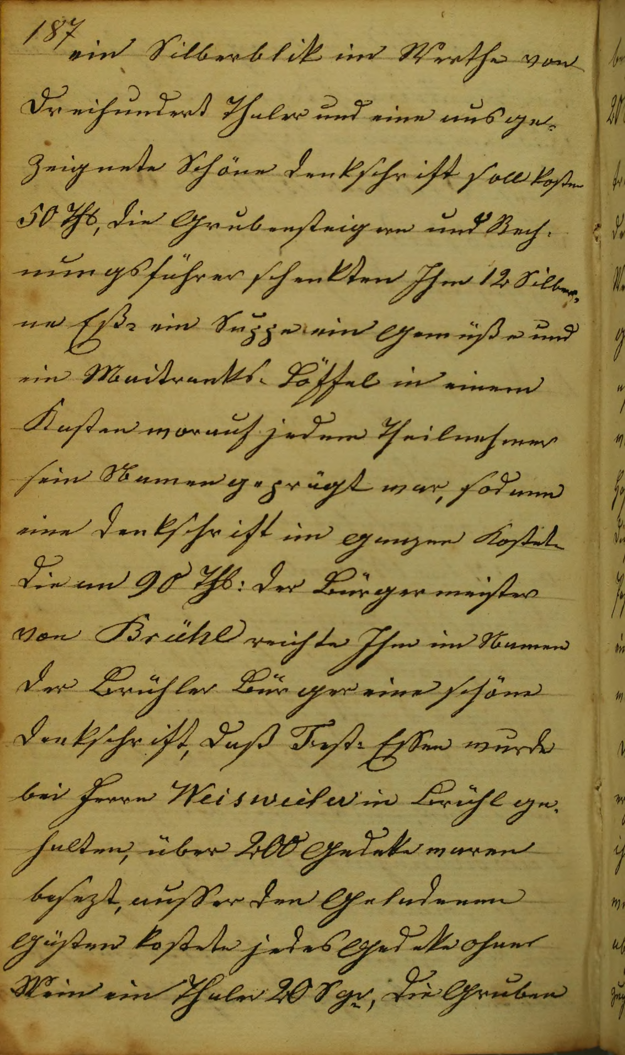 ein Silberblik im Werthe von dreihundert Thaler und eine ausgezeignete Schöne Denkschrift soll kosten 50 Thl, die Grubensteigern und Rechnungsführer schenkten Ihm 12 Silberne Eß- ein Suppe ein Gemüße und ein Maitranks-Löffel in einem Kasten worauf jedem Theilnehmer sein Namen geprägt war, sodann eine Denkschrift im ganzen kostete die an 90 Thl: der Bürgermeister von Brühl reichte Ihm im Namen der Brühler Bürger eine schöne Denkschrift, daß Fest-Essen wurde bei Herrn Weisweiler in Brühl gehalten, über 200 Gedeke waren besezt, ausser den Geladenen Gästen kostete jedes Gedeke ohne Wein ein Thaler 20 Sgr, die Grubensteigern
