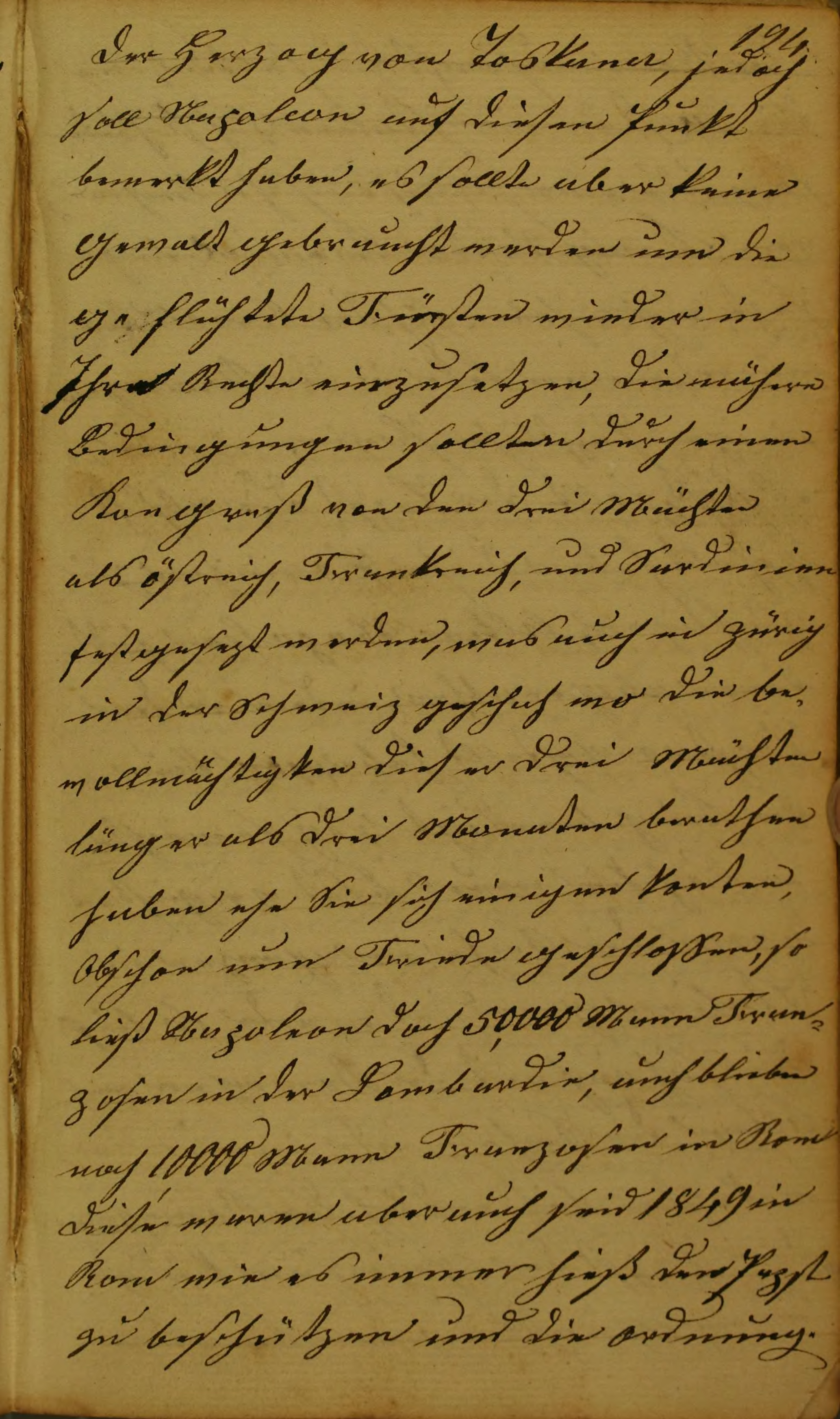 der Herzog von Toskana, jedoch soll Napoleon auf diesen Punkt bemerkt haben, es sollte aber keine Gewalt gebraucht werden um die geflüchtete Fürsten wieder in Ihre Rechte einzusetzen, die nähere Bedingungen sollten durch einen Kongreß von den drei Mächten als Östreich, Frankreich, und Sardinien festgesezt werden, was auch in Zürig in der Schweiz geschah wo die bevollmächtigten dieser drei Mächte länger als drei Monaten berathen haben ehe Sie sich einigen konten,