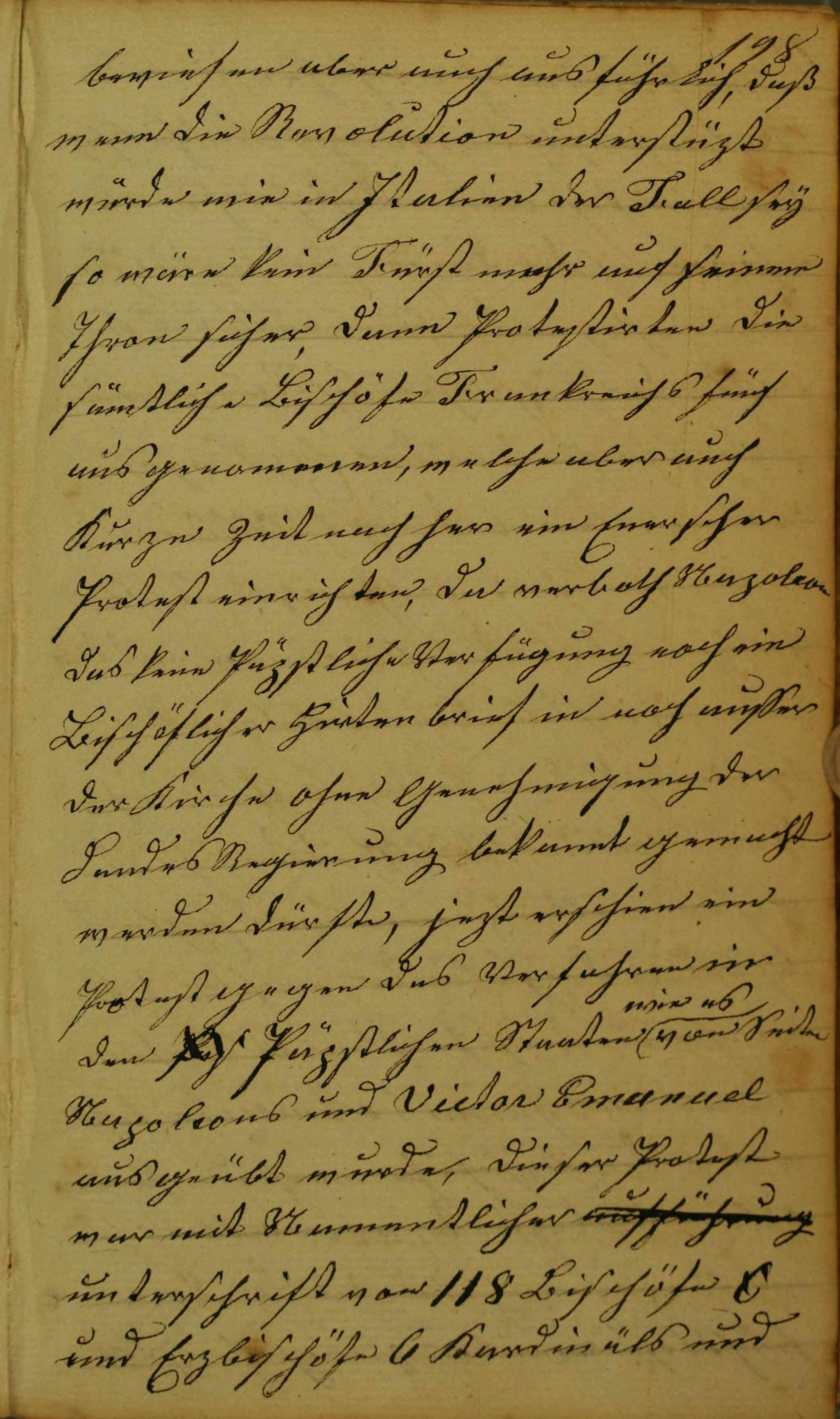 bewiesen aber auch ausführlich, daß wenn die Revolution unterstüzt würde wie in Italien der Fall sey so wäre kein Fürst mehr auf seinem Thron sicher, dann Protestirten die sämtliche Bischöfe Frankreichs fünf ausgenommen, welche aber auch kurze Zeit nachher ein Enarscher Protest einrichten, da verboth Napoleon das kein Päpstliche Verfügung noch ein Bischöflicher Hirtenbrief in noch außer der Kirche ohne Genehmigung der Landesregierung bekannt gemacht werden dürfte, jezt erschien ein Protest gegen das Verfahren in den Päpstlichen Staaten wie es von Seiten Napoleons und Victor Emanuel ausgeübt wurde, dieser Protest war mit Namentlicher aufführung unterschrift von 118 Bischofe und Erzbischofe 6 Kardinäls und