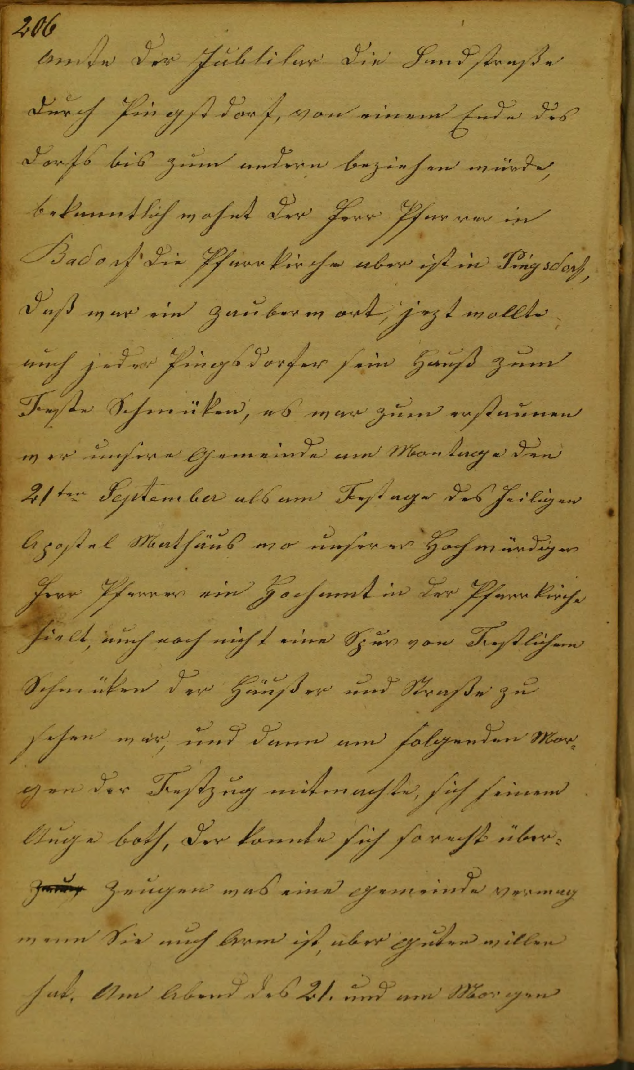 der Jublilar die Landstraße durch Pingstdorf, von einem Ende des Dorfs bis zum andern beziehen würde, bekanntlich wohnt der Herr Pfarrer in Badorf die Pfarrkirche aber ist in Pingsdorf, daß war ein zauberwort, jezt wollte auch jeder Pingsdorfer sein Hauß zum Feste Schmüken, es war zum erstaunen wer unsere Gemeinde am Montage den 21ten September als am Festage des Heiligen Apostel Mathäus wo unserer Hochwürdiger Herr Pfarrer ein Hochamt in der Pfarrkirche hielt, auch noch nicht eine Spur von Festlichem Schmüken der Häußer und Straße zu sehen war, und dann am folgenden Morgen der Festzug mitmachte, sich seinem Auge both, der konnte sich so recht überzeugen was eine Gemeinde vermag wenn Sie auch Arm ist, aber Guten willen hat. Am Abend des 21. und am Morgen