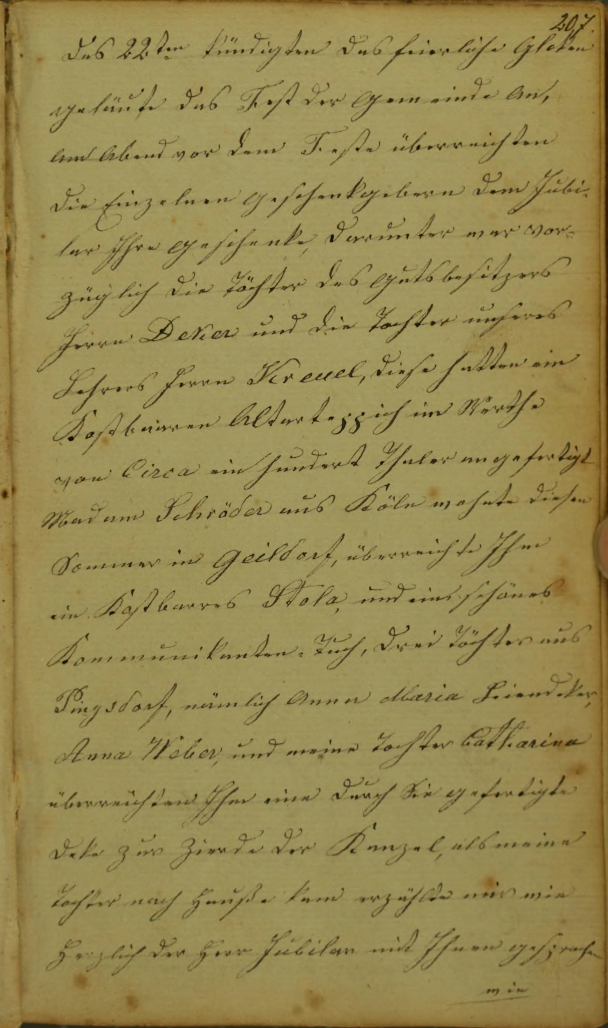 des 22ten kündigten das feierliche Glokengeläute das Fest der Gemeinde an, Am Abend vor dem Feste überreichten die Einzelnen Geschenkgebern dem Jubilar Ihre Geschenke, darunter war vorzüglich die Töchter des Gutsbesitzers Herrn Deker und die Tochter unseres Lehrers Herrn Kreuel, diese hatten ein Kostbaaren Altarteppich im Werthe von Circa einhundert Thaler angefertigt Madam Schröder aus Köln wohnte diesen Sommer in Geildorf überreichte Ihm ein Kostbaares Stola, und ein schönes Kommunikanten-Tuch, drei Töchter aus Pingsdorf, nämlich Anna Maria Leiendeker, Anna Weber, und meine Tochter Catharina überreichten Ihm eine durch Sie gefertigte Deke zur Zierde der Kanzel, als meine Tochter nach Hauße kam erzählte mir wie Herzlich der Herr Jubilar mit Ihnen gesprochen
