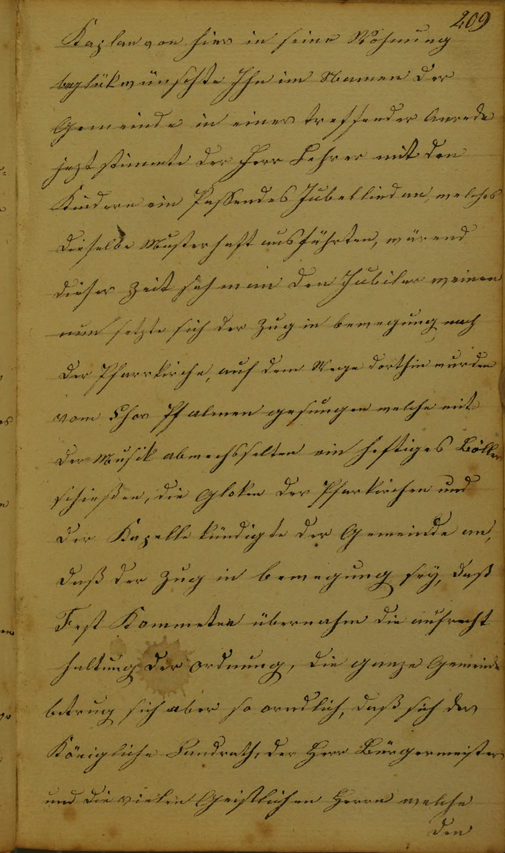 Kaplan von hier in seine Wohnung beglükwünschte Ihn im Namen der Gemeinde in einer treffender Anrede jezt stimmte der Herr Lehrer mit den Kindern ein Passendes Jubellied an, welches dieselbe Musterhaft ausführten, wärend dieser Zeit sah man den Jubilar weinen nun setzte sich der Zug in bewegung nach der Pfarrkirche, auf dem Wege dorthin wurden vom Chor Psalmen gesungen welche mit der Musik abwechsselten ein heftiges Böllerschießen, die Gloken der Pfarrkirchen und der Kapelle kündigte der Gemeinde an, daß der Zug in bewegung sey, daß Festkommetee übernahm die aufrechthaltung der Ordnung, die ganze Gemeinde betrug sich aber so orndlich, daß sich der Königliche Landrath, der Herr Bürgermeister und die vielen Geistlichen Herrn welche den