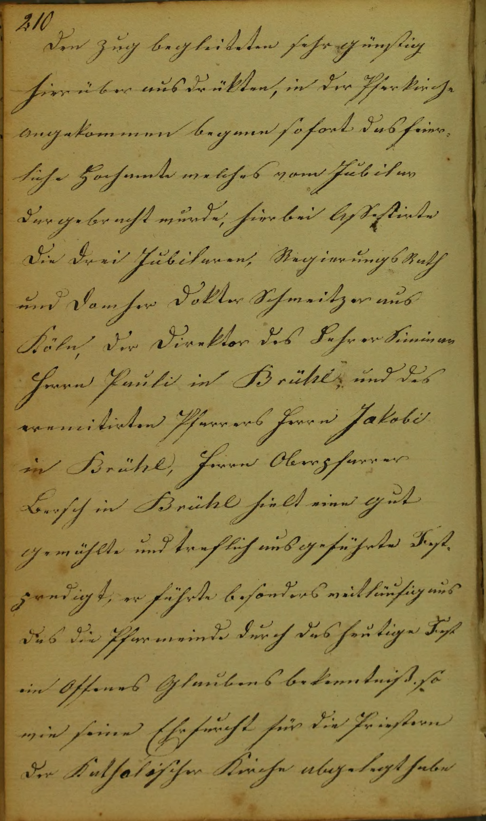 Zug begleiteten sehr günstig hierüber ausdrükten, in der Pfarkirche angekommen begann sofort das feierliche Hochamte welches vom Jubilar dargebracht wurde, hierbei Assestirte die drei Jubilaren, RegierungsRath und Domher Dokter Schweitzer aus Köln, der Direktor des LehrerSiminar Herrn Pauli in Brühl, und des eremitirten Pfarrers Herrn Jakobi in Brühl, Herrn Oberpfarrer Bersch in Brühl hielt eine gut gewählte und treflich ausgeführte Festpredigt, er führte besonders weitläufig aus das die Pfarr(ge)meinde durch das heutige Fest ein Offenes Glaubensbekenntniß sowie seine Ehrfurcht für die Priestern der Katholischer Kirche abgelegt habe