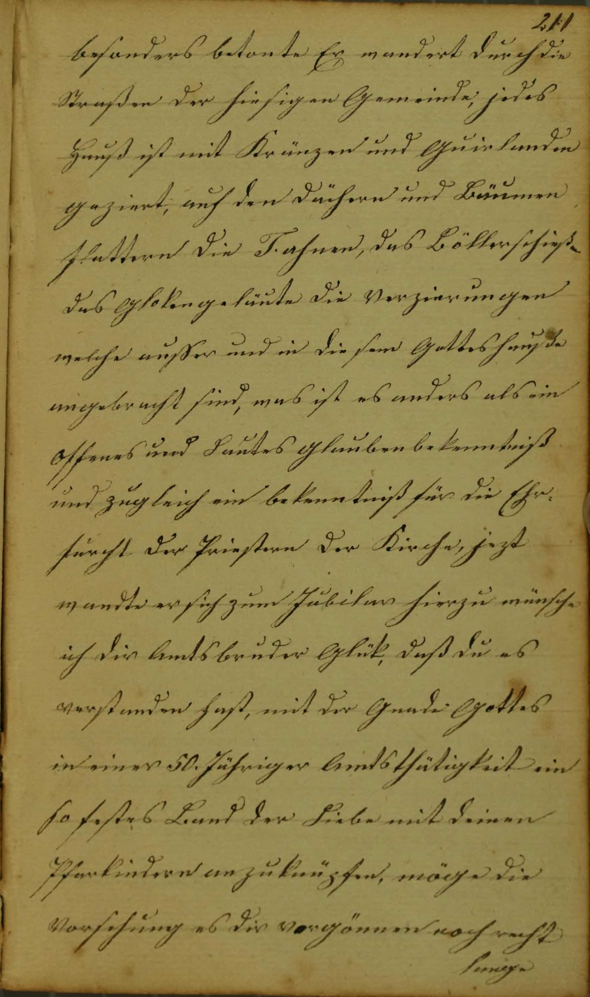 besonders betonte Er wandert durch die Straßen der hiesigen Gemeinde, jedes Hauß ist mit Kränzen und Guirlanden geziert, auf den Dächern und Bäumen flattern die Fahnen, das Böllerschießen das Glokengeläute die Verzierungen welche außer und in diesem Gotteshauße angebracht sind, was ist es anders als ein Offenes und Lautes Glaubenbekenntniß und zugleich ein bekenntniß für die Ehrfurcht der Priestern der Kirche, jezt wandte er sich zum Jubilar hierzu wünsche ich dir Amtsbruder Glük, daß du es verstanden hast, mit der Gnade Gottes in einer 50.Jähriger Amtsthätigkeit ein so festes Band der Liebe mit deinen Pfarkindern anzuknüpfen, möge die Vorsehung es dir vergönnen noch recht lange