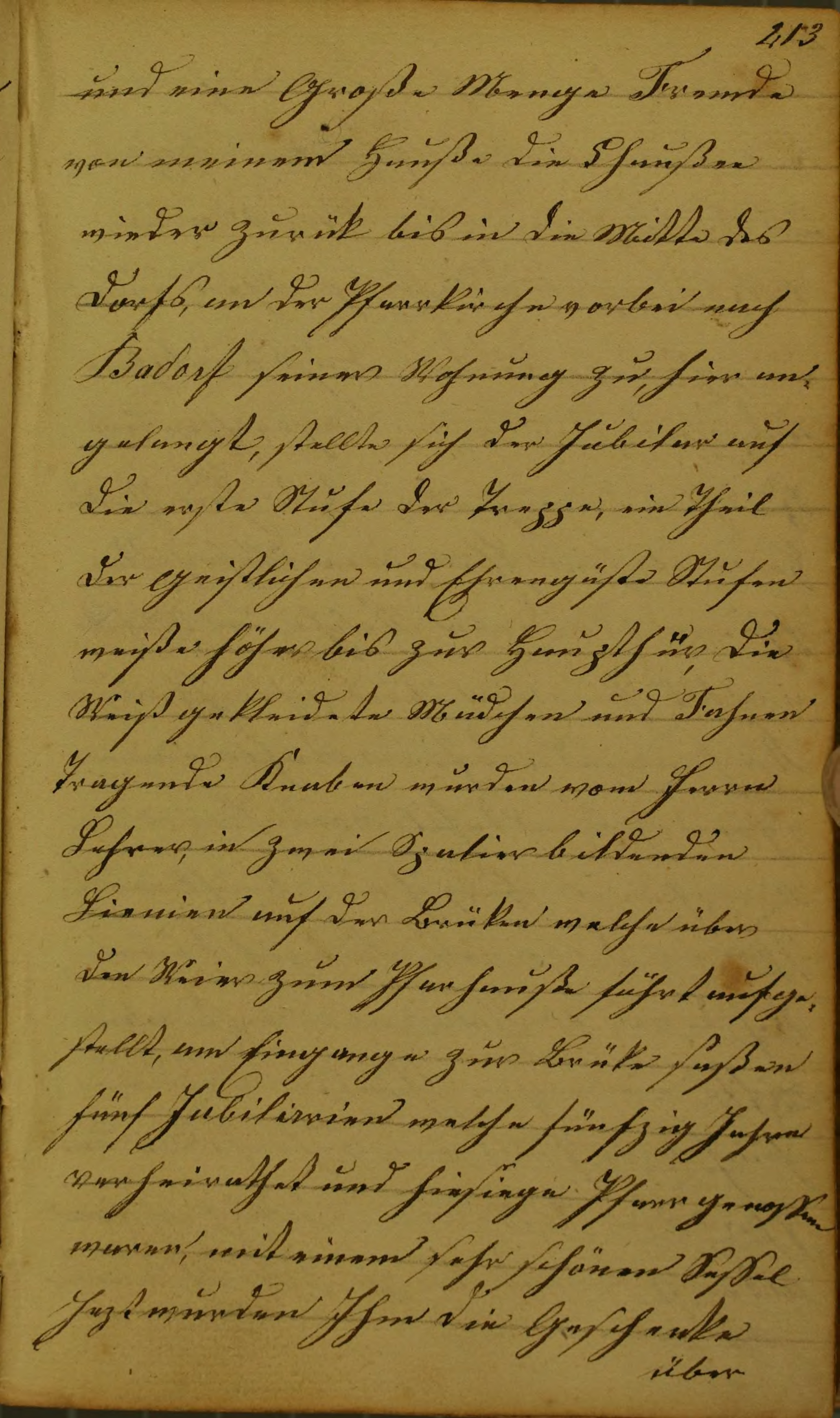 und eine Große Menge Freunde von meinem Hauße die Chaußee wieder zurük bis in die Mitte des Dorfs, an der Pfarrkirche vorbei nach Badorf seiner Wohnung zu, hier angelangt, stellte sich der Jublilar auf die erste Stufe der Treppe, ein Theil der Geistlichen und Ehrengäste Stufenweiße höher bis zur Haupthür, die Weiß gekleidete Mädchen und Fahnen Tragende Knaben wurden vom Herrn Lehrer, in zwei Spalierbildenden Lienien auf der Brüken welche über den Weier zum Pfarhauße führt aufgestellt, am Eingange zur Brüke saßen fünf Jubilirrien welche fünfzig Jahren verheirathet und hiesiege Pfarrgenossen waren, mit einem sehr schönen Sessel Jezt wurden Ihm die Geschenke