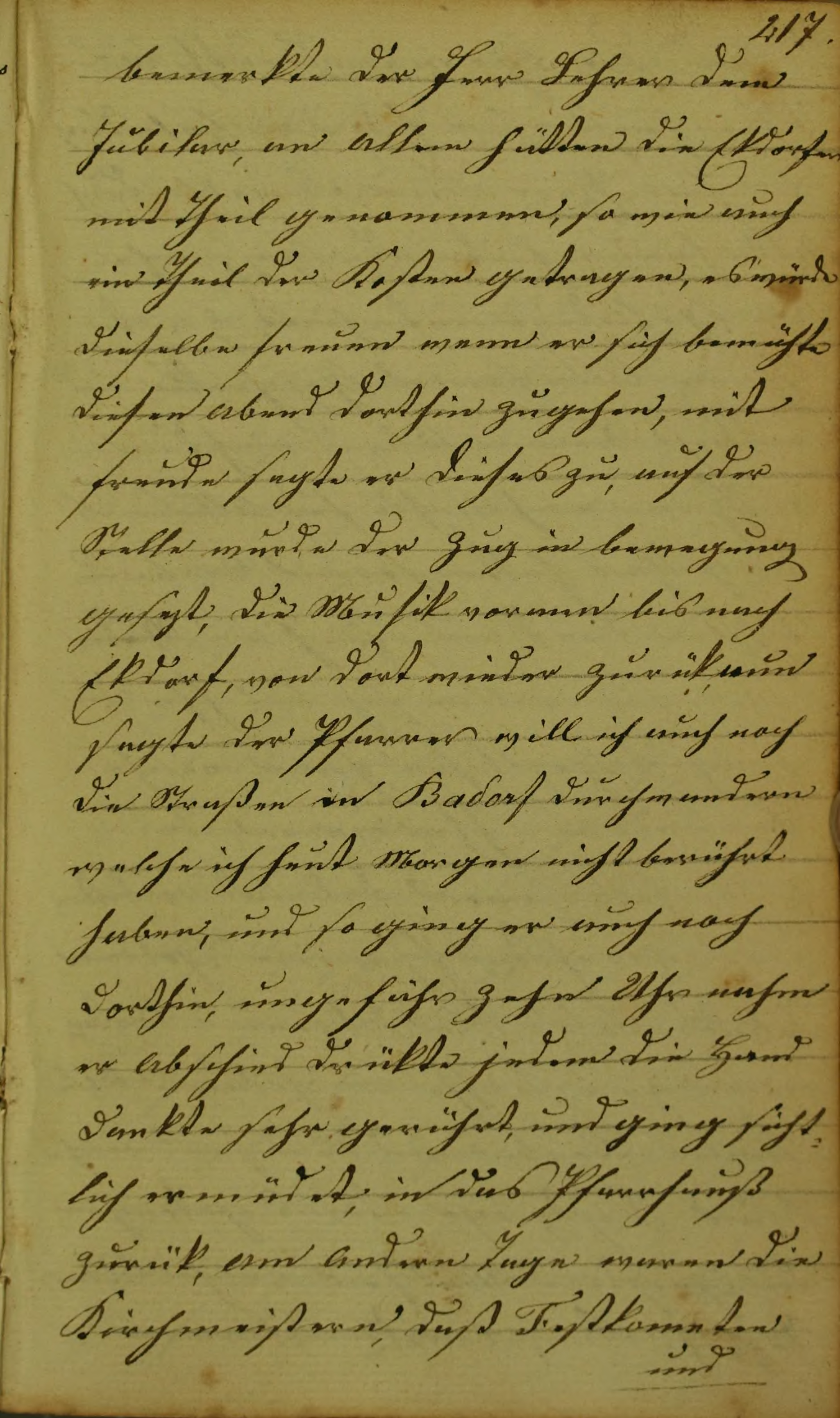 bemerkte der Herr Lehrer dem Jubilar, an allem hätten die Ekdorfer mit Theil genommen, so wie auch ein Theil der Kosten getragen, es würde dieselben freuen wenn er sich bemühte diesen Abend dorthin zu gehen, mit freude sagte er dieses zu, auf der Stelle wurde der Zug in bewegung gesezt, die Musik vorann bis nach Ekdorf, von dort wieder zurük, nun sagte der Pfarrer will ich auch noch die Straßen in Badorf durchwandern welche ich heut Morgen nicht berührt haben, und so ging er auch noch dorthin, ungefähr zehn Uhr nahm er Abschied drükte jedem die Hand dankte sehr gerührt, und ging sichtlich ermüdet, in das Pfarrhauß zurück, am andern Tage waren die Kirchmeistern, daß Festkometee