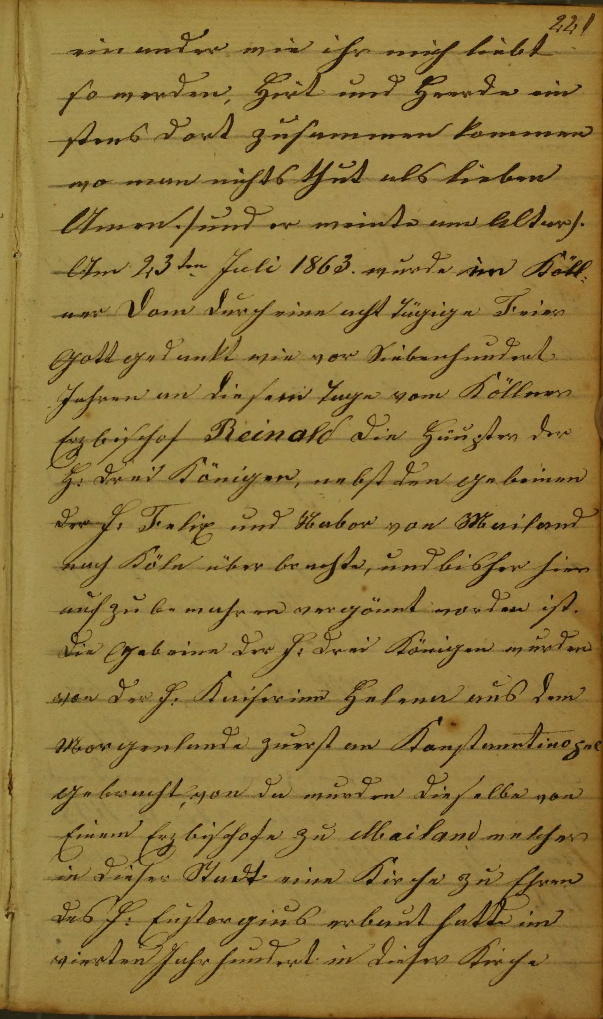 Am 23ten Juli 1863. wurde im Köllner Dom durch eine acht Tägige Feier Gott gedankt wie vor Siebenhundert Jahren an diesem Tage vom Köllner Erzbischof Reinald die Häupter der H. drei Königen, nebst den Gebeinen der H: Felix und Nabor von Mailand nach Köln überbrachte, und bisher hier auzubewahren vergönnt worden ist. Die Gebeine der H: drei Königen wurden von der H: Kaiserinn Helena aus dem Morgenlande zuerst an Konstantinopel gebracht, von da wurden dieselben von Einem Erzbischofe zu Mailand welcher in dieser Stadt eine Kirche zu Ehren des H: Eustorgius erbaut erbaut hatte im vierten Jahrhundert in dieser Kirche