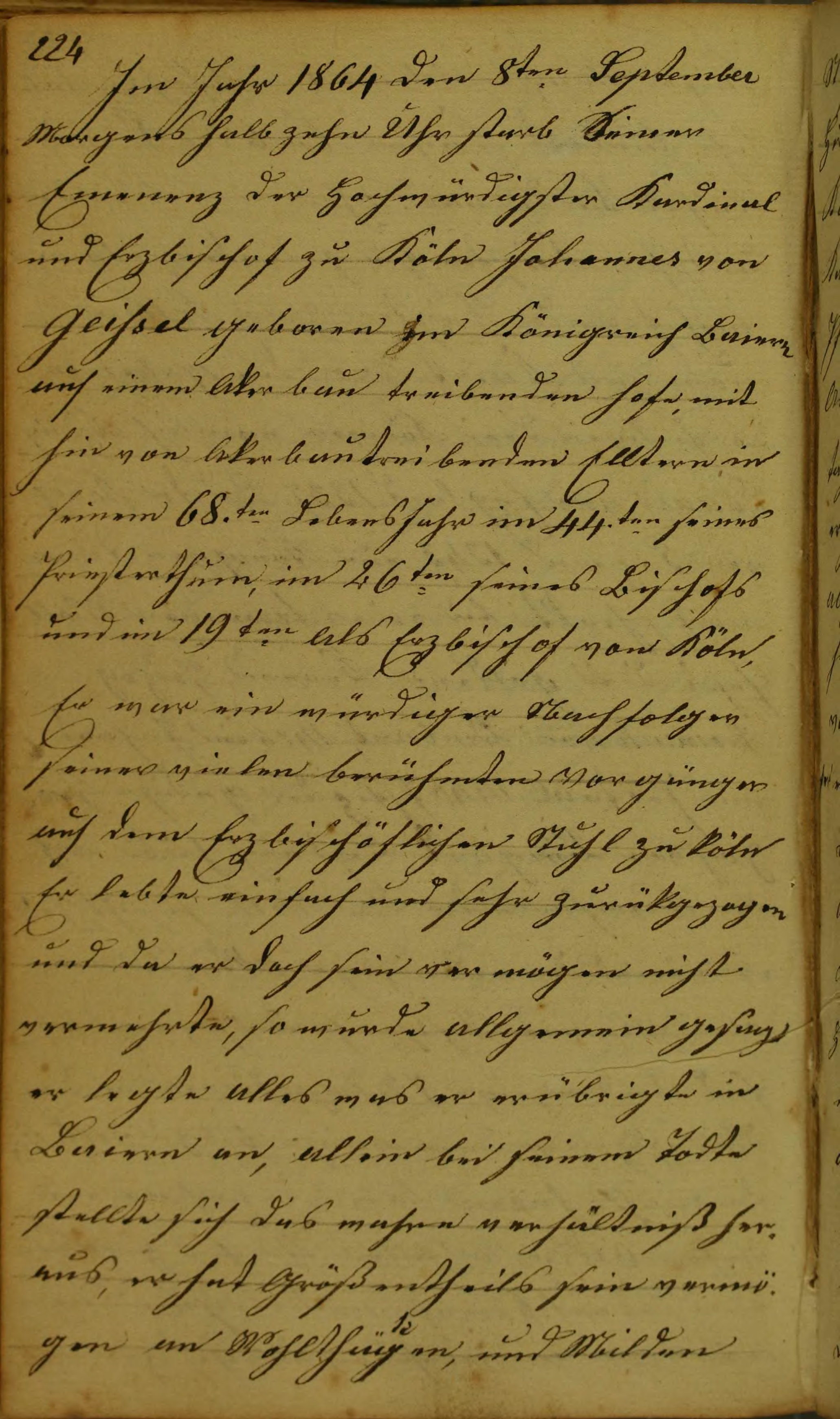 Im Jahr 1864 den 8ten September Morgens halb zehn Uhr starb Seiner Emenenz der Hochwürdigster Kardinal und Erzbischof zu Köln Johannes von Geissel geboren im Königreich Baiern auf einem Akerbau treibenden Hofe, mithin von Akerbau treibenden Elltern in seinem 68.ten Lebensjahr im 44.ten seines Priesterthum, im 26tenseines Bischofs und im 19ten als Erzbischof von Köln.