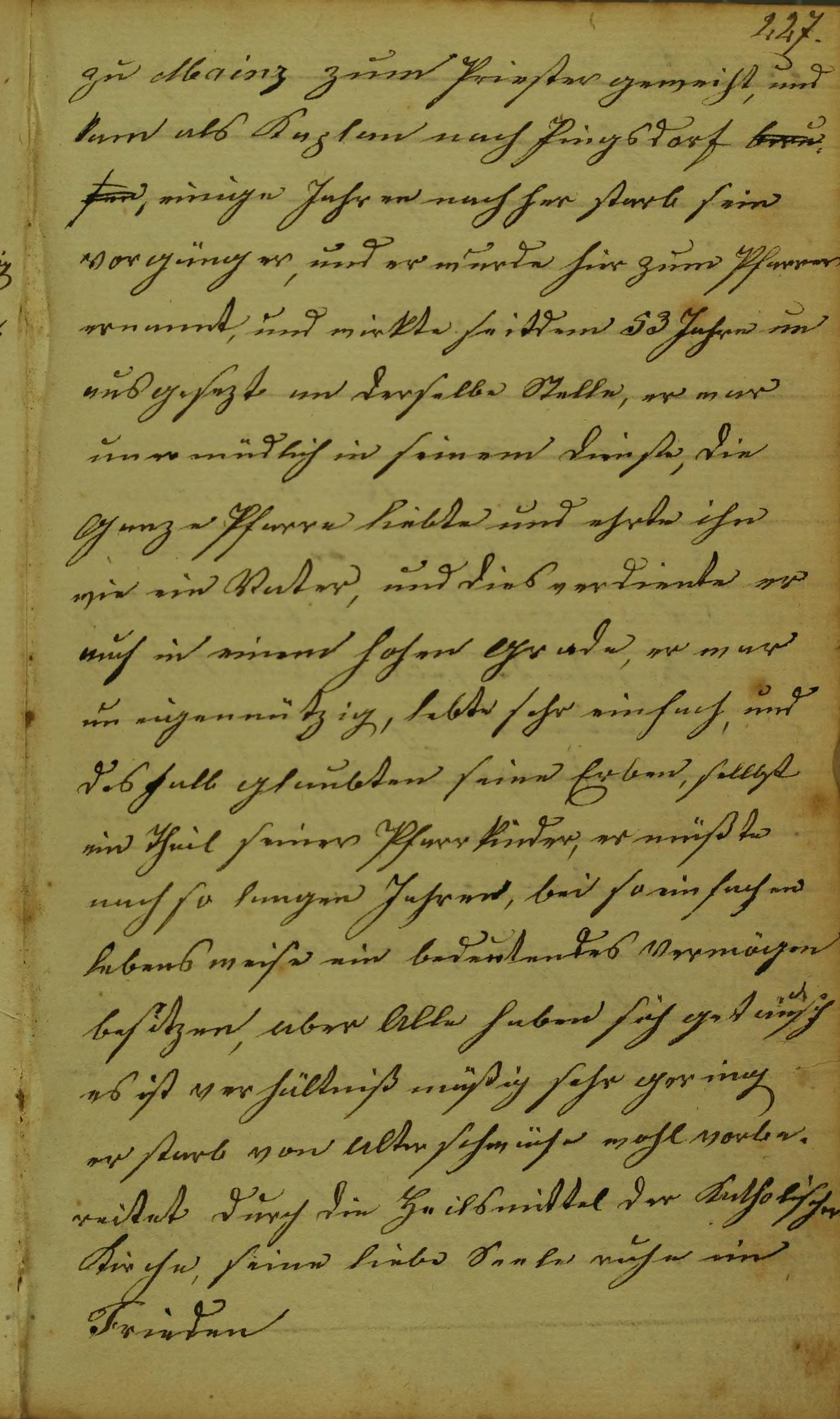 zu Mainz zum Priester geweiht, und kam als Kaplan nach Pingsdorf berufen, einige Jahren nachher starb sein Vorgänger, und er wurde hier zum Pfarrer ernannt, und wirkte seitdem 53 Jahre unausgesezt an derselben Stelle, er war unermüdlich in seinem Dienste, die Ganze Pfarre liebte und ehrte ihn wie ein Vater, und dies verdiente er auch in einem hohen Grade, er war uneigennützig, lebte sehr einfach, und deshalb glaubten seine Erben, sellbst ein Theil seiner Pfarrkinder, er müßte nach so langen Jahren, bei so einfachen lebensweise ein bedeutendes Vermögen besitzen, aber Alle haben sich getäuscht es ist verhaltnißmäßig sehr gering er starb von Alterschwäche wohlvorbereitet durch die Heilsmittel der Katholischer Kirche, seine liebe Seele ruhe im Frieden