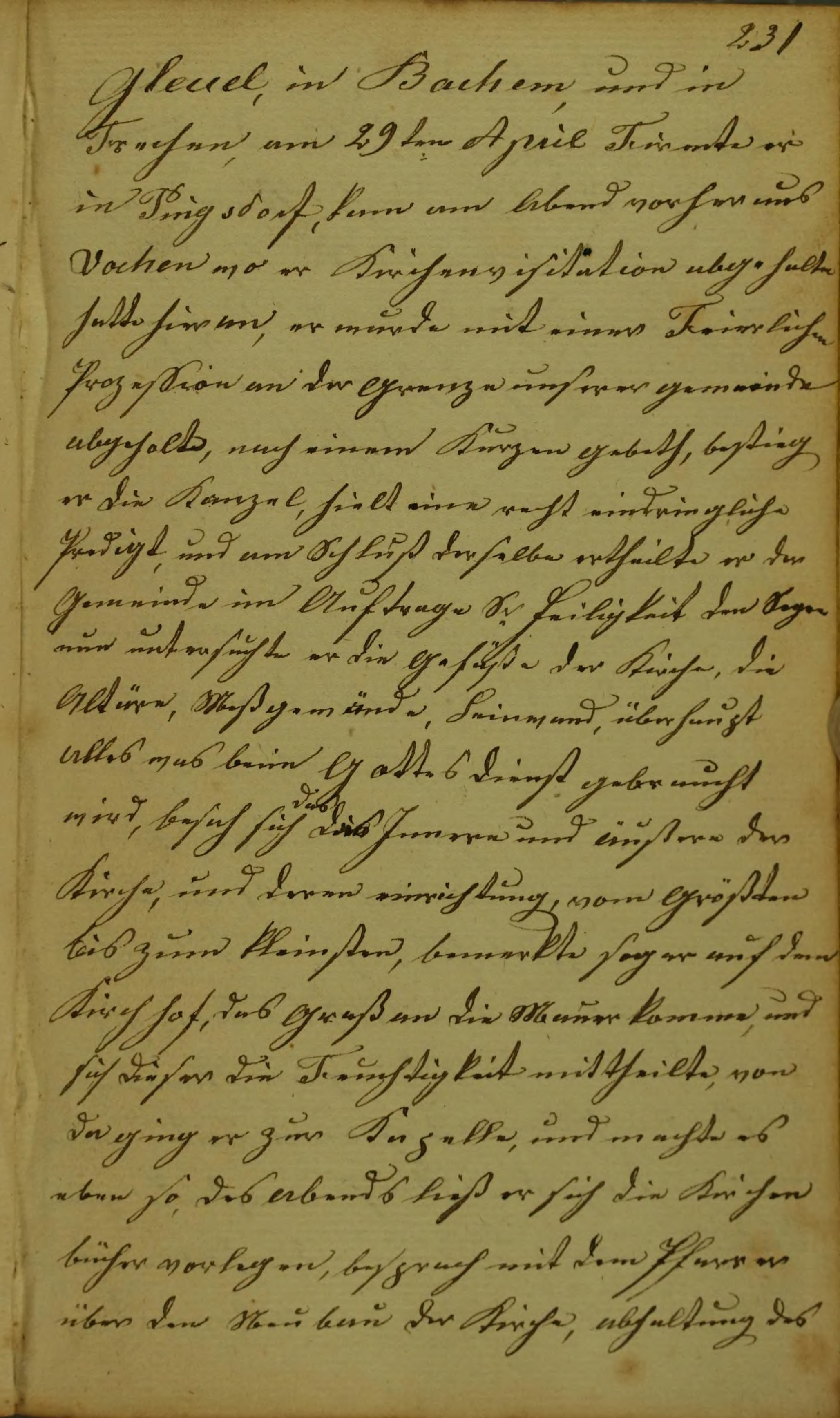 Gleuel, in Bachem und in Frechen, am 29ten April Firmte er in Pingsdorf, kam am Abend vorher aus Vochen wo er Kirchenvisitation abgehalten hatte hier an, er wurde mit einer Feierlichen Prozession an der Grenze unserer gemeinde abgeholt, nach einem Kurzen Gebeth, bestieg er die Kanzel, hielt eine recht eindringliche Predigt und am Schluß derselben ertheilte er der Gemeinde im Auftrage Sr. Heiligkeit den Segen nun untersuchte er die Gefäße der Kirche, die Altäre, Meßgewände, Leinwand, überhaupt Alles was beim Gottesdienst gebraucht wird, besah sich das Innere und Äußere der Kirche, und deren einrichtung, vom Größten bis zum Kleinsten, bemerkte sogar auf dem Kirchhof, das Graß an die Mauer komme, und sich dieser die Feuchtigkeit mittheilte, von da ging er zur Kapelle, und machte es eben so, des Abends ließ er sich die Kirchenbücher vorlegen, besprach mit dem Pfarrer über den Neubau der Kirche, abhaltung des