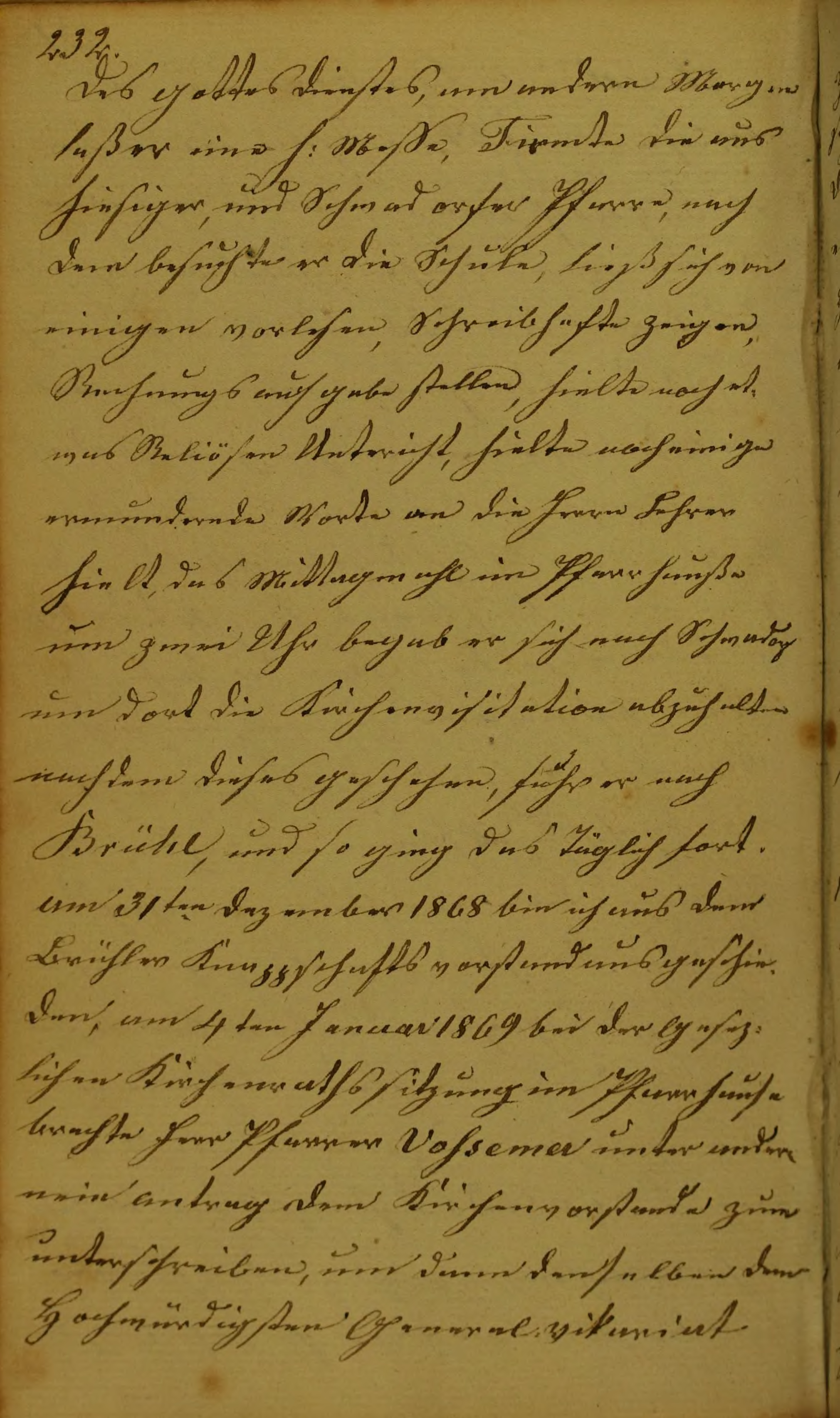 Am 31ten Dezember 1868 bin ich aus dem Brühler Knappschaftsvorstand ausgeschieden, am 4ten Janaur 1869 bei der Gesezlichen Kirchenrathssitzung im Pfarrhause brachte Herr Pfarrer Vohsemer unter andern nein Antrag dem Kirchenvorstande zum unterschreiben, um dann denselben dem Hochwürdigsten Generalvikariat