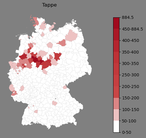 Relative Verteilung des Namens Tappe (1996)Direkt zur Karte Die Farbskala zeigt die Anzahl von "Tappe" bezogen auf je 1 Million Einträge. |