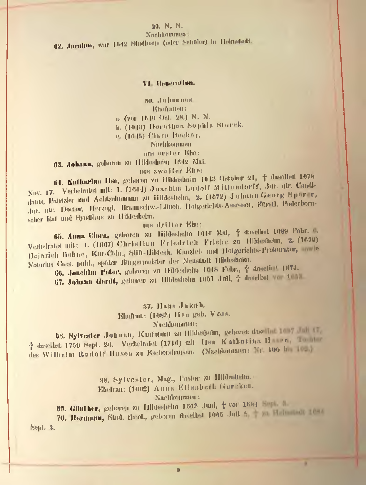 65. Anna Clara, geboren zu Hildesheim 1640 Mai, + daselbst 1680 Febr. 6. Verheiratet mit; 1. (1667) Christian Friedrich Fricke zu Hildesheim, 2. (1679) Heinrich Bohne, Kur-Cöln-, Stift-Hildesh. Kanzlei- und Hofgerichts-Prokurator, sowie Notarius Caes. publ., später Bürgermeister der Neustadt Hildesheim.