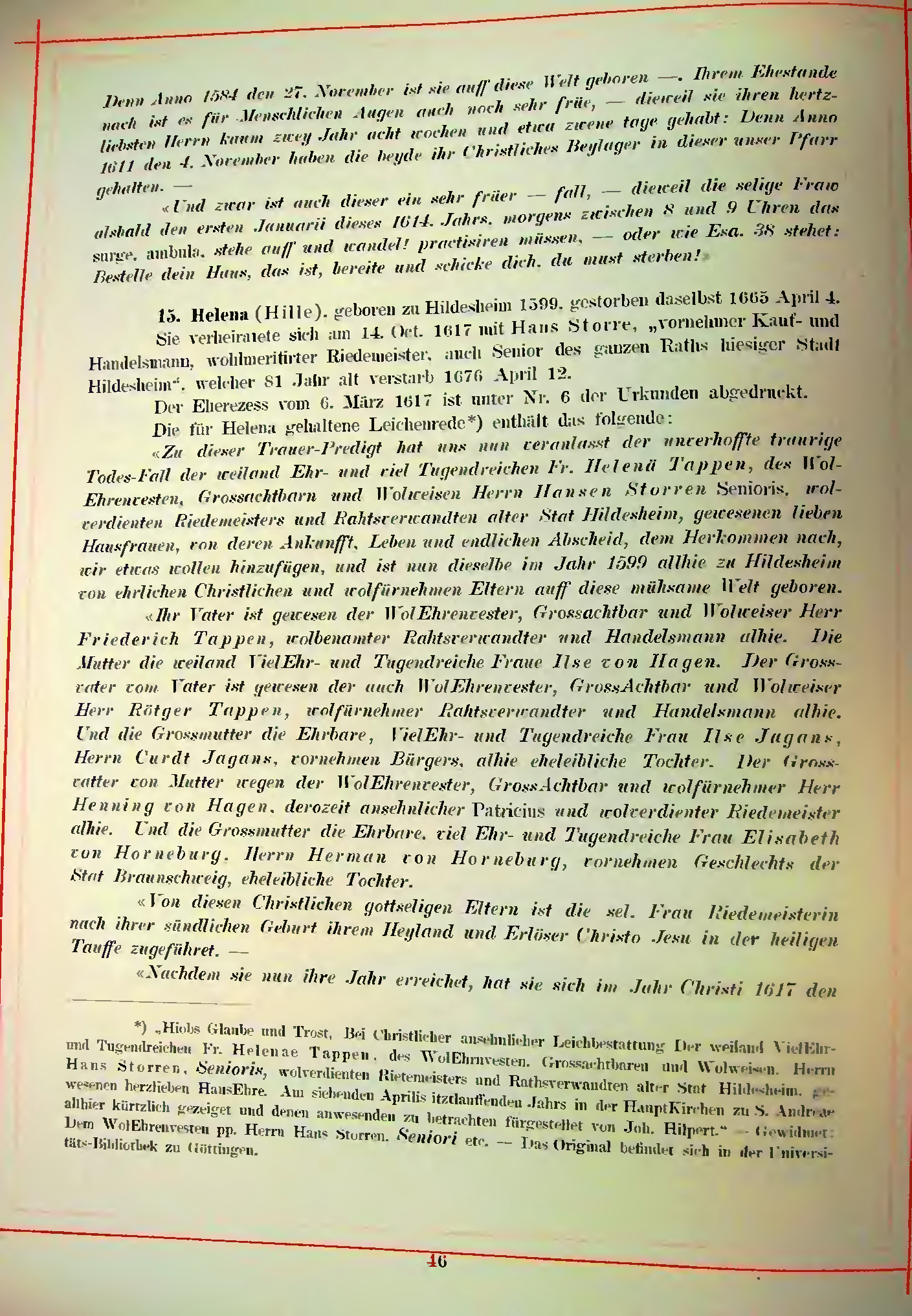 "Zu dieser Trauer-Predigt hat uns nun veranlasst der unverhoffte traurige Todes-Fall der weiland Ehr- und viel Tugendreichen Fr. Helenä Tappen, des WolEhrenvesten, Grossachtbarn und Wolweisen Herrn Hansen Storren Senioris, wolverdienten Riedemeisters und Rahtsverwandten alter Stat Hildesheim, gewesenen lieben Hausfrauen, von deren Ankunfft, Leben und endlichen Abscheid, dem Herkommen nach, wir etwas wollen hinzufügen, und ist nun dieselbe im Jahr 1599 allhie zu Hildesheim von ehrlichen Christlichen und wolfürnehmen Eltern auff diese mühsame Welt geboren.