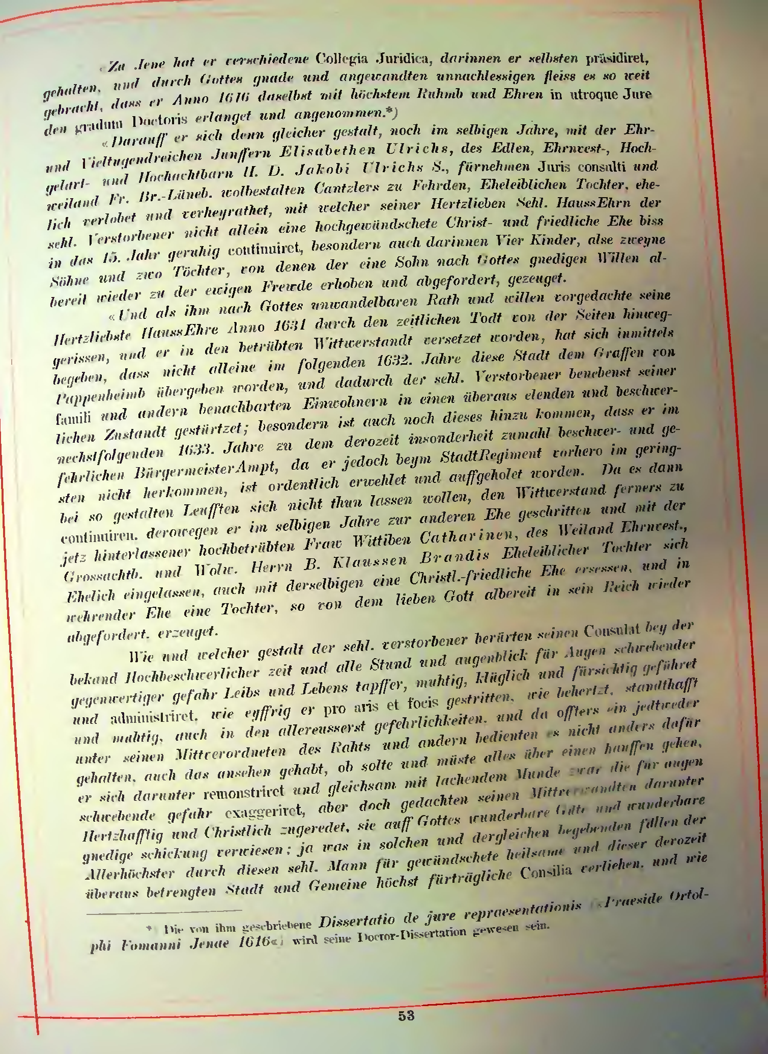 Zu Jene hat er verschiedene Collegia Juridica, darinnen er selbsten präsidiret, gehalten, und durch Gottes gnade und angewandten unnachlessigen fleiss es so weit gebracht, dann er Anno 1616 daselbst mit höchstem Ruhmb und Ehren in utroque Jure den gratdum Doctoris erlanget und angenommen [1]