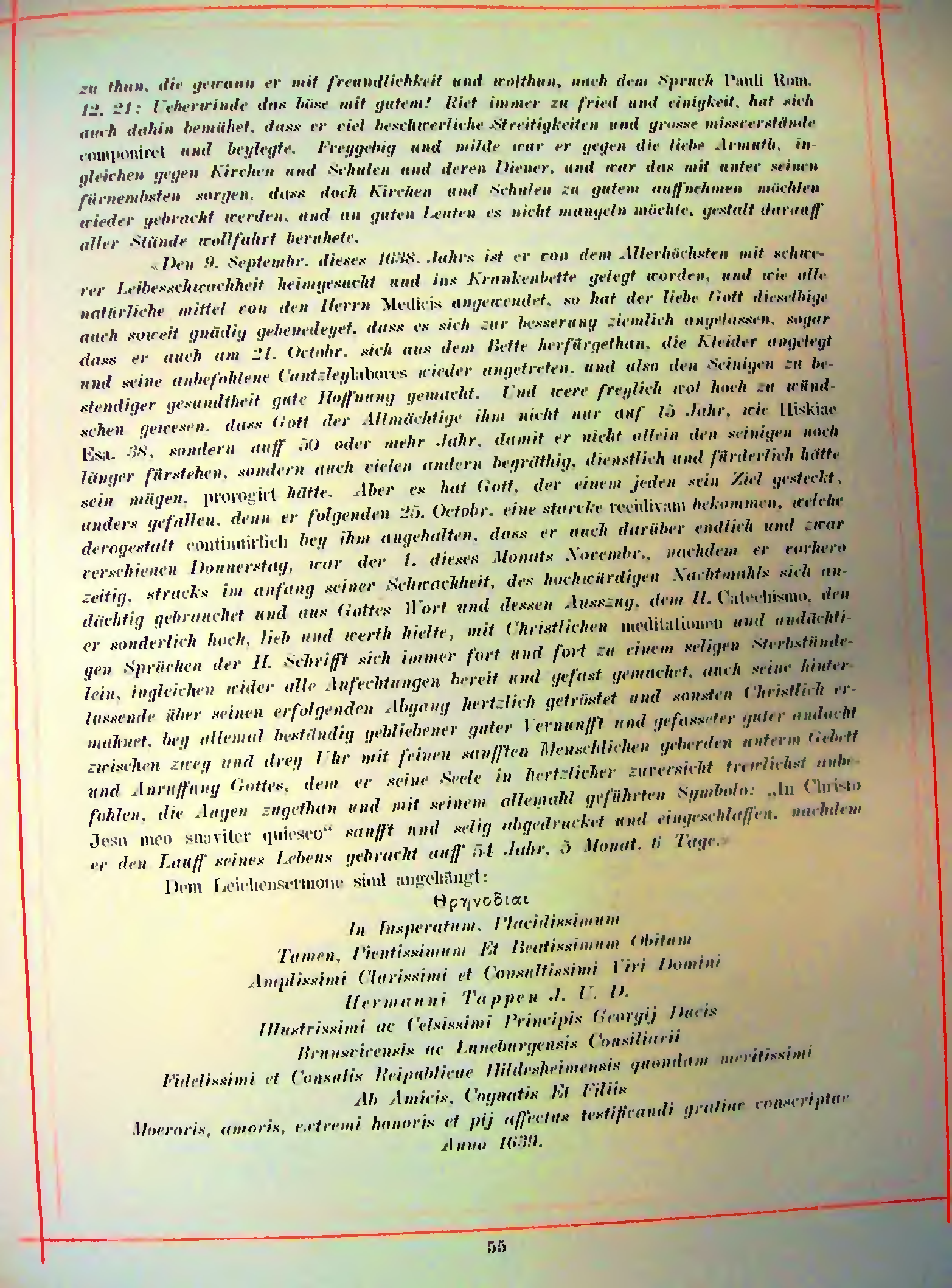 Den 9. Septembr. dieses 1638. Jahrs ist er von dem Allerhöchsten mit schwerer Leibesschwachheit heimgesucht und ins Krankenbette gelegt worden, und wie alle natürliche mittel von den Herrn Medicis angewendet, so hat der liebe Gott dieselbige auch soweit gnädig gebenedeyet, dass es sich zur besserung ziemlich angelassen, sogar dass er auch am 21. Octobr. sich aus dem Bette herfürgethan, die Kleider angelegt und seine anbefohlene Cantzleylabores wieder angetreten, und also den Seinigen zu bestendiger gesundtheit gute Hoffnung gemacht. Und were freylich wol hoch zu wündschen gewesen, dass Gott der Allmächtige ihm nicht nur auf 15 Jahr, wie Hiskiae Esa. 38, sondern auff 50 oder mehr Jahr, damit er nicht allein den seinigen noch länger fürstehen, sondern auch vielen ändern beyräthig, dienstlich und fürderlich hätte sein mügen, prorogirt hätte. Aber es hat Gott, der einem jeden sein Ziel gesteckt, anders gefallen, denn er folgenden 25. Octobr. eine starcke recidivam bekommen, welche derogestalt continuirlich bey ihm angehalten, dass er auch darüber endlich und zwar verschienen Donnerstag, war der 1. dieses Monats Novembr., nachdem er vorhero zeitig, stracks im anfang seiner Schwachheit, des hochwürdigen Nachtmahls sich andächtig gebrauchet und aus Gottes Wort und dessen Ausszug, dem H. Cateehismo den er sonderlich hoch, lieb und werth hielte, mit Christlichen meditationen und andächtigen Sprüchen der H. Schrifft sich immer fort und fort zu einem seligen Sterbstündelein, ingleichen wider alle Anfechtungen bereit und gefast gemachet, auch seine hinterlassende über seinen erfolgenden Abgang hertzlich getröstet und sonsten Christlich ermahnet, bey allemal beständig gebliebener guter Vernunfft und gefasseter guter andacht zwischen zwey und drey Uhr mit feinen sanfften Menschlichen geberden unterm Gebett und Anruffung Gottes, dem er seine Seele in hertzlicher Zuversicht trewlichst anbefohlen, die Augen zugethan und mit seinem allemahl geführten Symbolo: "In Christo Jesu meo suaviter quiesco" sanfft und selig abgedrucket und eingeschlaffen, nachdem er den Lauff seines Lebens gebracht auff 54 Jahr, 5 Monat, 6 Tage.