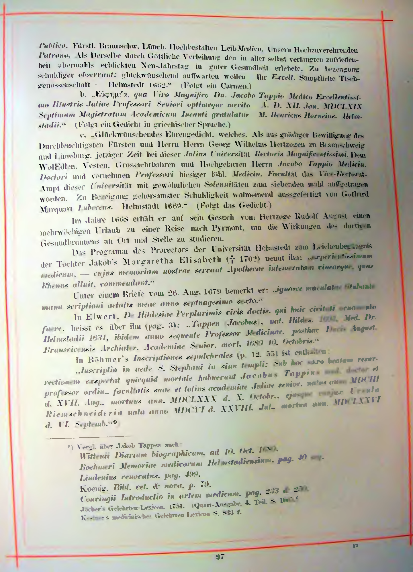 b. "Eόφηρία, qua Viro Magnifico Dn. Jacobo Tappio Medico Excellentissimo Illustris Juliae Professori Seniori optimeque merito A. D. XII. Jan. MDCLXIX Septimum Magistratum Academicum Ineunti gratulatur M. Henricus Horneius. Helmstadii." (Folgt ein Gedicht in griechischer Sprache.)