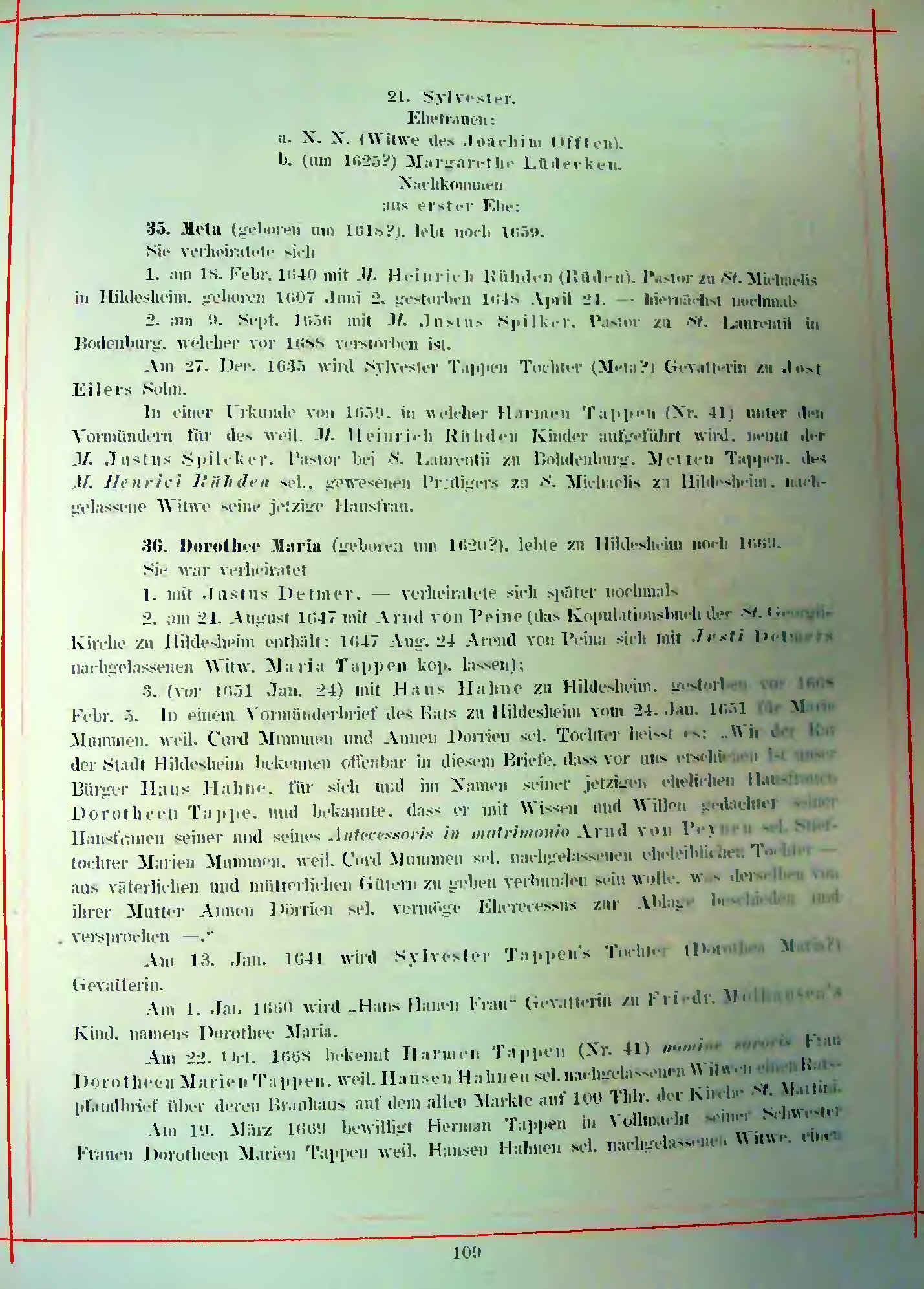 In einer Urkunde von 1659, in welcher Harmen Tappen (Nr. 41) unter den Vormündern für des weil. M. Heinrich Rühden Kinder aufgeführt wird, nennt der M. Justus Spilcker, Pastor bei S. Laurenii zu Bohdenburg, Metten Tappen, des M. Henrici Rühden sel., gewesenen Predigers zu S. Michaelis zu Hildesheim, nachgelassene Witwe seine jetzige Hausfrau.