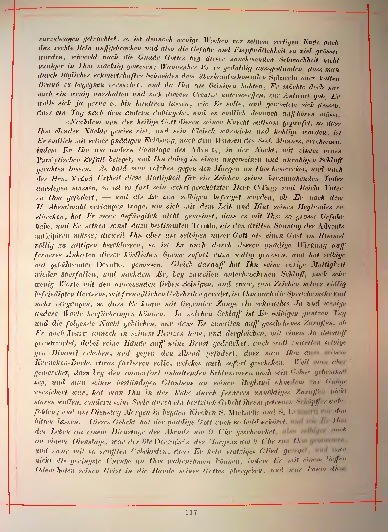 Nachdem nun der heilige Gott diesen seinen Knecht sattsam geprüfet, so dass Ihm elender Nächte gewiss viel, und sein Fleisch würmicht und kohtigt worden, ist Er endlich mit seiner gnädigen Erlösung, nach dem Wunsch des Seel. Mannes, erschienen, indem Er Ihn am andern Sonntage des Advents, in der Nacht, mit einem neuen Paralytischen Zufall beleget, und Ihn dabey in einen ungemeinen und unruhigen Schlaff gerahten lassen. So bald man solchen gegen den Morgen an Ihm bemercket, und nach des Hrn. Medici Urtheil diese Mattigkeit für ein Zeichen seines herannahenden Todes ausslegen müssen, so ist so fort sein wehrt-geschätzter Herr Collega und Beicht-Vater zu Ihm gefodert, - und als Er von selbigen befraget worden, ob Er nach dem H. Abendmahl verlangen trage, um sich mit dem Leib und Blut seines Heylandes zu stärcken, hat Er zwar anfänglich nicht gemeinet, dass es mit Ihm so grosse Gefahr habe, und Er seinen sonst dazu bestimmten Termin, als den dritten Sonntag des Advents anticipiren müsse: dieweil Ihn aber am selbigen unser Gott als einen Gast im Himmel völlig zu sättigen beschlossen, so ist Er auch durch dessen gnädige Wirkung auff ferneres Anbieten dieser köstlichen Speise sofort dazu willig gewesen, und hat selbige mit gebührender Devotion genossen. Gleich darauff hat Ihn seine vorige Mattigkeit wieder überfallen, und nachdem Er, bey zuweilen unterbrochenen Schlaff, noch sehr wenig Worte mit den anwesenden lieben Seinigen, und zwar, zum Zeichen seines völlig befriedigten Hertzens, mit freundlichen Gebehrden geredet, ist Ihm auch die Sprache mehr und mehr vergangen, so dass Er kaum mit liegender Zunge ein schwaches Ja und wenige andere Worte herfürbringen können. In solchen Schlaff ist Er selbigen gantzen Tag und die folgende Nacht geblieben, nur dass Er zuweilen auff geschehenes Zuruffen, ob Er auch Jesum annoch in seinem Hertzen habe, und dergleichen, mit einem Ja darauff geantwortet, dabei seine Hände auff seine Brust gedrücket, auch woll zuweilen selbige gen Himmel erhoben, und gegen den Abend gefodert, dass man Ihm auss seinem Krancken-Buche etwas fürlessen solle, welches auch sofort geschehen. Weil man aber gemercket, dass bey den immerfort anhaltenden Schlummern auch sein Gehör gehemmet sey, und man seines beständigen Glaubens an seinen Heyland ohnedem zur Gnüge versichert war, hat man Ihn in der Ruhe durch ferneres unnöhtiges Zuruffen nicht stören wollen, sondern seine Seele durch ein hertzlich Gebeht ihrem getreuen Schöpfer anbefohlen; und am Dienstag Morgen in bey den Kirchen S. Michaelis und S. Lamberti vor ihm bitten lassen. Dieses Gebeht hat der gnädige Gott auch so bald erhöret, und wie Er Ihm das Leben an einem Dienstage des Abends um 9 Uhr geschencket, also selbiges auch an einem Dienstage, war der 6te Decembris, des Morgens um 9 Uhr von Ihm genommen, und zwar mit so sanfften Gebehrden, dass Er kein eintziges Glied gereget, und man nicht die geringste Unruhe an Ihm wahrnehmen können, indem Er mit einem tiefen Odem-holen seinen Geist in die Hände seines Gottes übergeben; und war kaum diese
