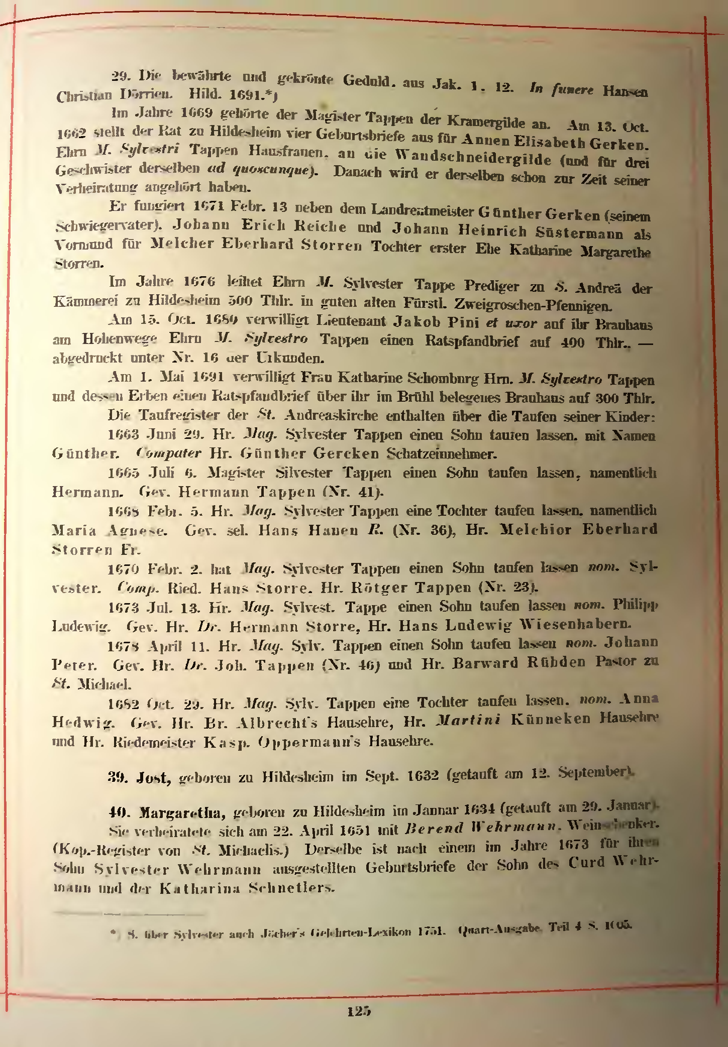 Im Jahre 1676 leihet Ehrn M. Sylvester Tappe Prediger zu S. Andreä der Kämmerei zu Hildesheim 500 Thlr. in guten alten Fürstl. Zweigroschen-Pfennigen.