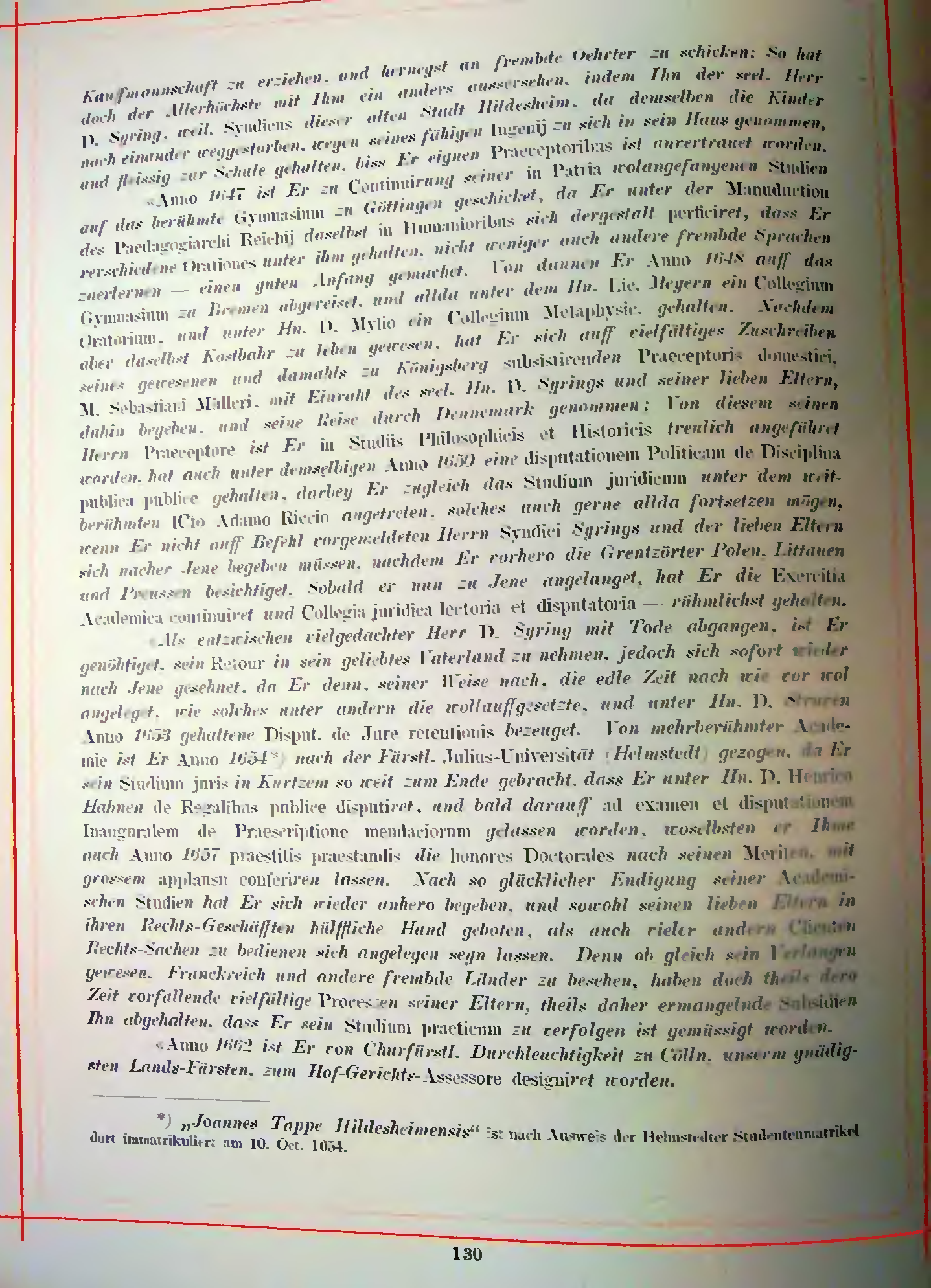 Als entzwischen viel gedachter Herr D. Syring mit Tode abgangen, ist Er genöhtiget, sein Retour in sein geliebtes Vaterland zu nehmen, jedoch sich sofort wieder nach Jene gesehnet, da Er denn, seiner Weise nach, die edle Zeit nach wie vor wol angeleget, wie solches unter ändern die wollauffgesetzte, und unter Hn. D. Struven Anno 1663 gehaltene Disput, de Jure retentionis bezeuget. Von mehrberühmter Akademie ist Er Anno 1654 [1] nach der Fürstl. Julius-Universität (Helmstedt) gezogen, da Er sein Studium juris in Kurtzem so weit zum Ende gebracht, dass Er unter Hn. D. Henrico Hahnen de Regalibus publice disputiret, und bald darauff ad examen et disputationem Inauguralem de Praescriptione mendaciorum gelassen worden, woselbsten er Ihme auch Anno 1657 praestitis praestandis die honores Doctorales nach seinen Meriten, mit grossem applausu conferiren lassen. Nach so glücklicher Endigung seiner Acadeinischen Studien hat Er sich wieder anhero begeben, und sowohl seinen lieben Eltern in ihren Rechts-Geschäfften hülffliche Hand geboten, als auch vieler andern Clienten Rechts-Sachen zu bedienen sich angelegen seyn lassen. Denn ob gleich sein Verlangen gewesen, Franckreich und andere frembde Länder zu besehen, haben doch theils dero Zeit vorfallende vielfältige Processen seiner Eltern, theils daher ermangelnde Subsidien Ihn abgehalten, dass Er sein Studium practicum zu verfolgen ist gemüssigt worden.