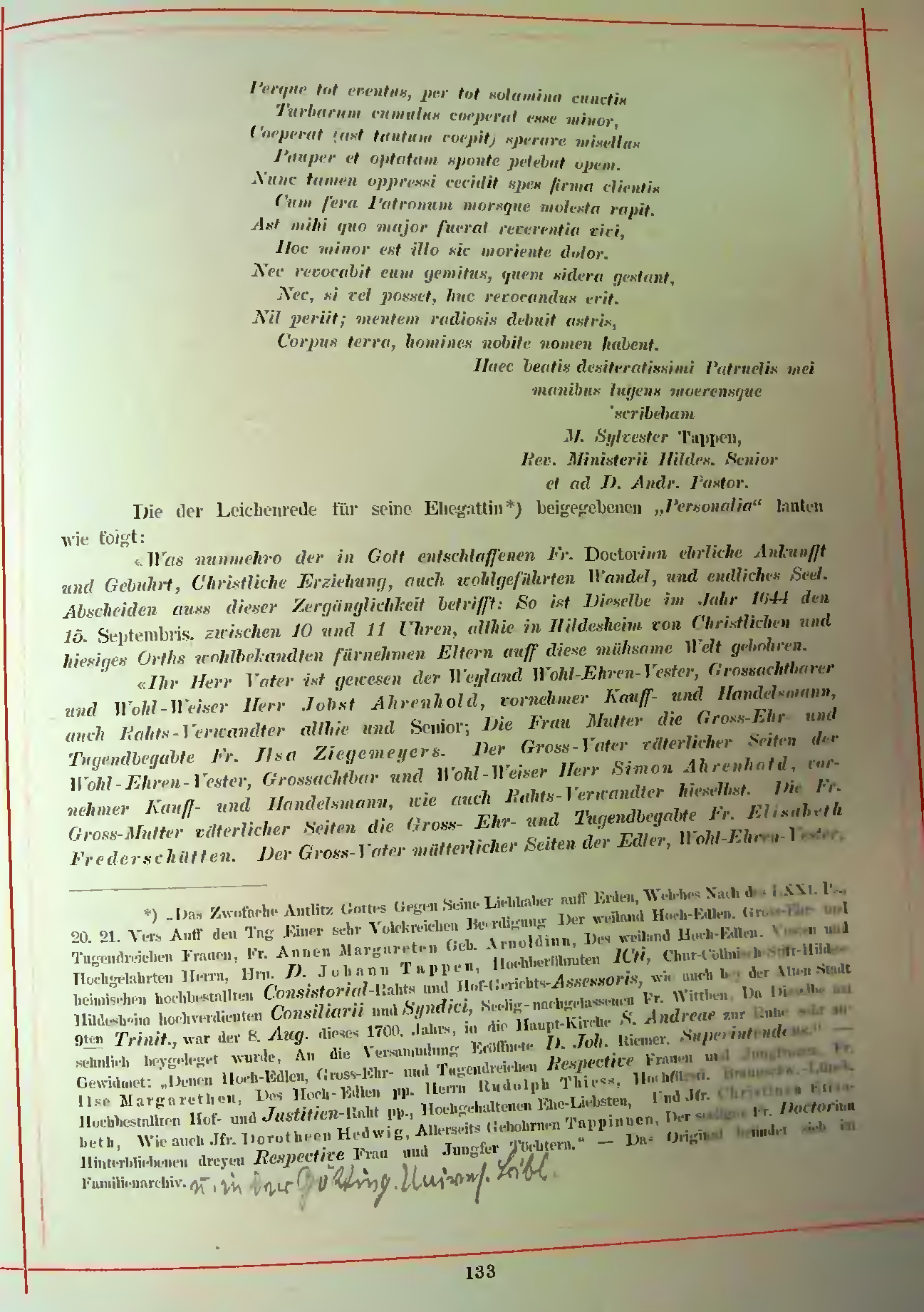 - ↑ "Das Zwofache Antlitz Gottes Gegen Seine Liebhaber auff Erden, Welches Nach des LXXI. Ps., 20. 21. Vers Auff den Tag Einer sehr Volckreichen Beerdigung Der weiland Hoch-Edlen, Gross-Ehr- und Tugendreichen Frauen, Fr. Annen Margareten Geb. Arnoldinn, Des weiland Hoch-Edlen, Vesten und Hochgelahrten Herrn, Hrn. D. Johann Tappen, Hochberühmten ICti, Chur-Cöllnisch-Stift-Hildes-heimischen hochbestallten Consistorial-Rahts und Hof-Gerichts-Assessoris, wie auch bey der Alten Stadt Hildesheim hochverdienten Consiliarii und Syndici, Seelig-nachgelassenen Fr. Wittben, Da Dieselbe am 9ten Trinit., war der 8. Aug. dieses 1700. Jahrs, in die Haupt-Kirche S. Andreae zur Ruhe sehr ansehnlich beygeleget wurde, An die Versammlung Eröffnete D. Joh. Riemer, Superintendents" - Gewidmet: "Denen Hoch-Edlen, Gross-Ehr- und Tugendreichen Respective Frauen und Jungfrauen, Fr. Ilse Margarethen, Des Hoch-Edlen pp. Herrn Rudolph Thiess, Hochfürstl. Braunschw.-Lüneb. Hochbestallten Hof- und Justitien-Raht pp., Hochgehaltenen Ehe-Liebsten, Und Jfr. Christinen Elisabeth, Wie auch Jfr. Dorotheen Hedwig, Allerseits Gebohrnen Tappinnen, Der seligen Fr. Doctorinn Hinterbliebenen dreyen Respective Frau und Jungfer Töchtern." — Das Original befindet sich im Familienarchiv