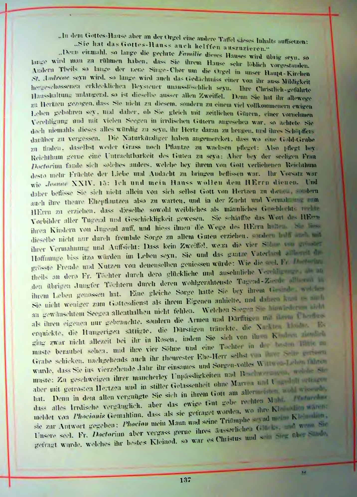 Denn einmahl, so lange die geehrte Familie dieses Hauses wird übrig seyn, so lange wird man zn rühmen haben, dass Sie ihrem Hause sehr löblich vorgestanden. Andern Theils so lange der neue Singe-Chor um die Orgel in unser Haupt-Kirchen St. Andreae seyn wird, so lange wird auch das Gedächtniss einer von ihr auss Mildigkeit hergeschossenen erklecklichen Beysteuer unausslöschlich seyn. Ihre Christlich-geführte Hausshaltung anlangend, so ist dieselbe ausser allen Zweifel. Denn Sie hat ihr allewege zu Hertzen gezogen, dass Sie nicht zu diesem, sondern zu einem viel vollkommenem ewigen Leben gebohren sey, und daher, ob Sie gleich mit zeitlichen Gütern, einer vornehmen Verehligung und mit vielen Seegen in irrdischen Gütern angesehen war, so achtete Sie doch niemahls dieses alles würdig zu seyn, ihr Hertz daran zu hengen, und ihres Schöpffers darüber zu vergessen. Die Naturkündiger haben angemercket, dass wo eine Gold-Grube zu finden, daselbst weder Grass noch Pflantze zu wachsen pfleget: Also pflegt bey Reichthum gerne eine Untrachtbarkeit des Guten zu seyn: Aber bey der seeligen Frau Doctorinn fande sich solches anders, welche bey ihrem von Gott verliehenen Reichthum desto mehr Früchte der Liebe und Andacht zu bringen beflissen war. Ihr Vorsatz war wie Josuae XXIV. 15: Ich und mein Hauss wollen dem HErrn dienen. Und daher beflisse Sie sich nicht allein von sich selbst Gott von Hertzen zu dienen, sondern auch ihre theure Ehepflantzen also zu warten, und in der Zucht und Vermahnung zum HErrn zu erziehen, dass dieselbe sowohl weibliches als männliches Geschlechts rechte Vorbilder aller Tugend und Geschickligkeit gewesen. Sie schärffte das Wort des HErrn ihren Kindern von Jugend auff, und hiess ihnen die Wege des HErrn halten. Sie liess dieselbe nicht nur durch frembde Sorge zu allem Guten erziehen, sondern ihrer Vermahnung und Auffsicht: Dass kein Zweiffel, wenn die vier Söhne von grösster Hoffnunge biss itzo würden im Leben seyn, Sie und das gantze Vaterland allbereit die grösste Freude und Nutzen von denenselben gemessen würde: Wie die seel. Fr. Doctorinn theils an dero Fr. Töchter durch dero glückliche und ansehnliche Verehligunge, als an den übrigen Jungfer Töchtern dureh deren wohlgerahtenste Tugend-Zierde allbereit in ihrem Leben genossen hat. Eine gleiche Sorge hatte Sie bey ihrem Gesinde, welches Sie nicht weniger zum Gottesdienst als ihrem Eigenen anhielte, und dahero kunt es auch an gewünschtem Seegen allenthalben nicht fehlen. Welchen Seegen Sie hinwiederum nicht als ihren eigenen nur gebrauchte, sondern die Armen und Dürftigen mit ihrem Überfluss erquickte, die Hungerigen sättigte, die Dürstigen tränckte, die Nackten kleidte. Es ging zwar nicht allezeit bei ihr in Rosen, indem Sie sich von ihren Kindern ziemlich muste beraubet sehen, und ihre vier Söhne und eine Tochter in der besten Blüte zu Grabe schicken, nachgehends auch ihr theurester Ehe-Herr selbst von ihrer Seite gerissen wurde, dass Sie ins vierzehende Jahr ihr einsames und Sorgen-volles Wittwen-Leben führen muste: Zu geschweigen ihrer mancherley Unpässligkeiten nnd Beschwerungen, welche Sie aber mit getrosten Hertzen und in stiller Gelassenheit ohne Murren und Ungedult ertragen hat. Denn in dem allen vergnügte Sie sich in ihrem Gott am allermeisten, wohl wissende, dass alles Irrdische vergänglich, aber das ewige Gut gebe rechten Muht. Plutarchus meldet von Phocionis Gemahlinn, dass als sie gefragot worden, wo ihre Kleinodien wären: sie zur Antwort gegeben: Phocion mein Mann und seine Triümphe seynd meine Kleinodien, Unsere seel. Fr. Doctorinn aber vergass gerne ihres äusserlichen Glücks, und wenn Sie gefragt wurde, welches ihr bestes Kleinod, so war es Christus und sein Sieg über Sünde,