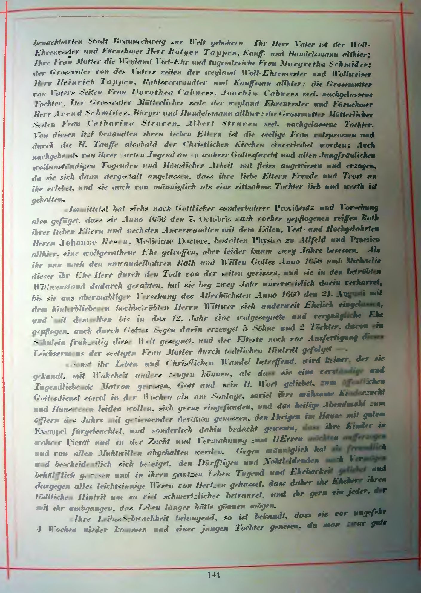 benachbarten Stadt Braunschweig zur Welt gebohren. Ihr Herr Vater ist der Woll-Ehrenvester nnd Fürnehmer Herr Rötger Tappen, Kauff- und Handelsmann allhier; Ihre Frau Mutter die Weyland Viel-Ehr nnd tugendreiche Frau Margretha Schmides; der Grossvater von des Vaters seiten der weyland Woll-Ehrenvester mnd Wollweiser Herr Heinrich Tappen. Rahtsverwandter und Kauffman allhier; die Großmutter von Vaters Seiten Frau Dorothea Cabuess, Joachim Cabuess seel. nachgelasse Tochter, Der Grossvater Mütterlicher seite der weyland Ehrenvester und Fürnehmer Herr Arend Schmides, Bürger und Handelsmann allhier: die Grossmutter Mütterlicher Seiten Frau Catharina Struven, Albert Struven seel. nachgelassene Tochter. Von diesen itzt benandten ihren lieben Eltern ist die seelige Frau entsprossen und durch die H. Tauffe alsobald der Christlichen Kirchen einverleibet worden; Auch nachgehends von ihrer zarten Jugend an zu wahrer Gottesfurcht und allen Jungfräulichen wollanständigen Tugenden und Häuslicher Arbeit mit fleiss angewiesen und erzogen, da sie sich dann dergestalt angelassen, dass ihre liebe Eltern Freude und Trost an ihr erlebet, und sie auch von männiglich als eine sittsahme Tochter lieb und werth ist gehalten.