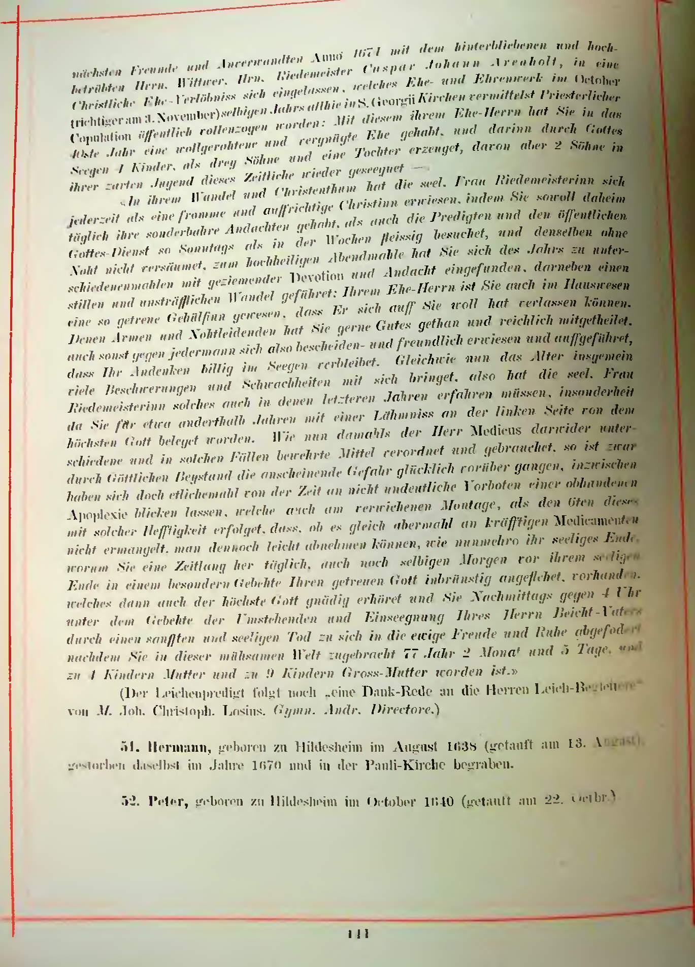 51. Hermann, geboren zu Hildesheim im August 1638 (getauft am 13. August), gestorben daselbst im Jahre 1670 nnd in der Pauli-Kirche begraben.