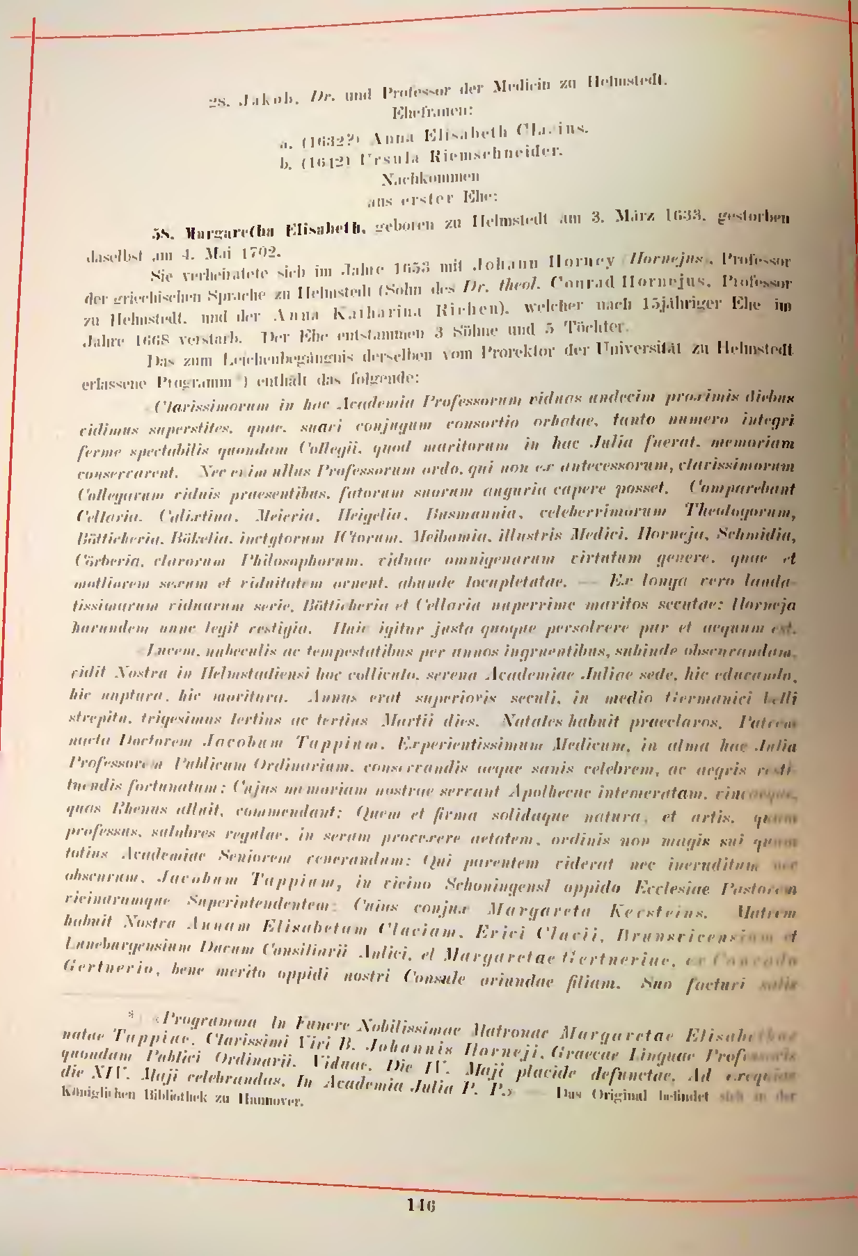 - ↑ "Programma In Vunere Nobilissimae Matronae Margaretae Elisabethae natae Tappiae, Clarissimi Viri B. Johannis Horneji, Graecae Linguae Professoris quondam Publici Ordinarii, Viduae, Die IV. Maji placide defunctae, Ad exequias die XIV. Maji celebrandas, In Academia Julia P. P." - Das Original befindet sich in der Königlichen Bibliotlick zu Hannover.