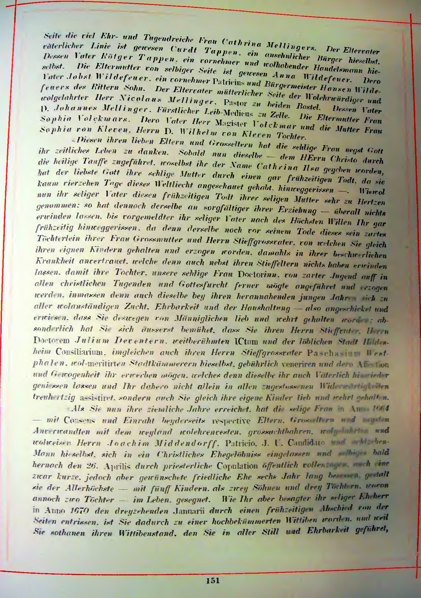 Seite die viel Ehr- und Tugendreiche Frau Cathrina Meilingers. Der Eltervater väterlicher Linie ist gewesen Curdt Tappen, ein ansehnlicher Bürger hieselbst. Dessen Vater Rötger Tappen, ein vornehmer und wolhabender Handelsmann hieselbst. Die Eltermutter von selbiger Seite ist gewesen Anna Wildefeuer. Dero Vater Jobst Wildefeuer, ein vornehmer Patricius und Bürgermeister Hansen Wildefeuers des Rittern Sohn. Der Eltervater mütterlicher Seite der Wolehrwürdiger und wolgelahrter Herr Nicolaus Mellinger, Pastor zu beiden Bostel. Dessen Vater D. Johannes Mellinger, Fürstlicher Leib-Medicus zu Zelle. Die Eltermutter Frau Sophia Volckmars. Dero Vater Herr Magister Volckmar und die Mutter Frau Sophia von Kleven, Herrn D. Wilhelm von Kleven Tochter.
