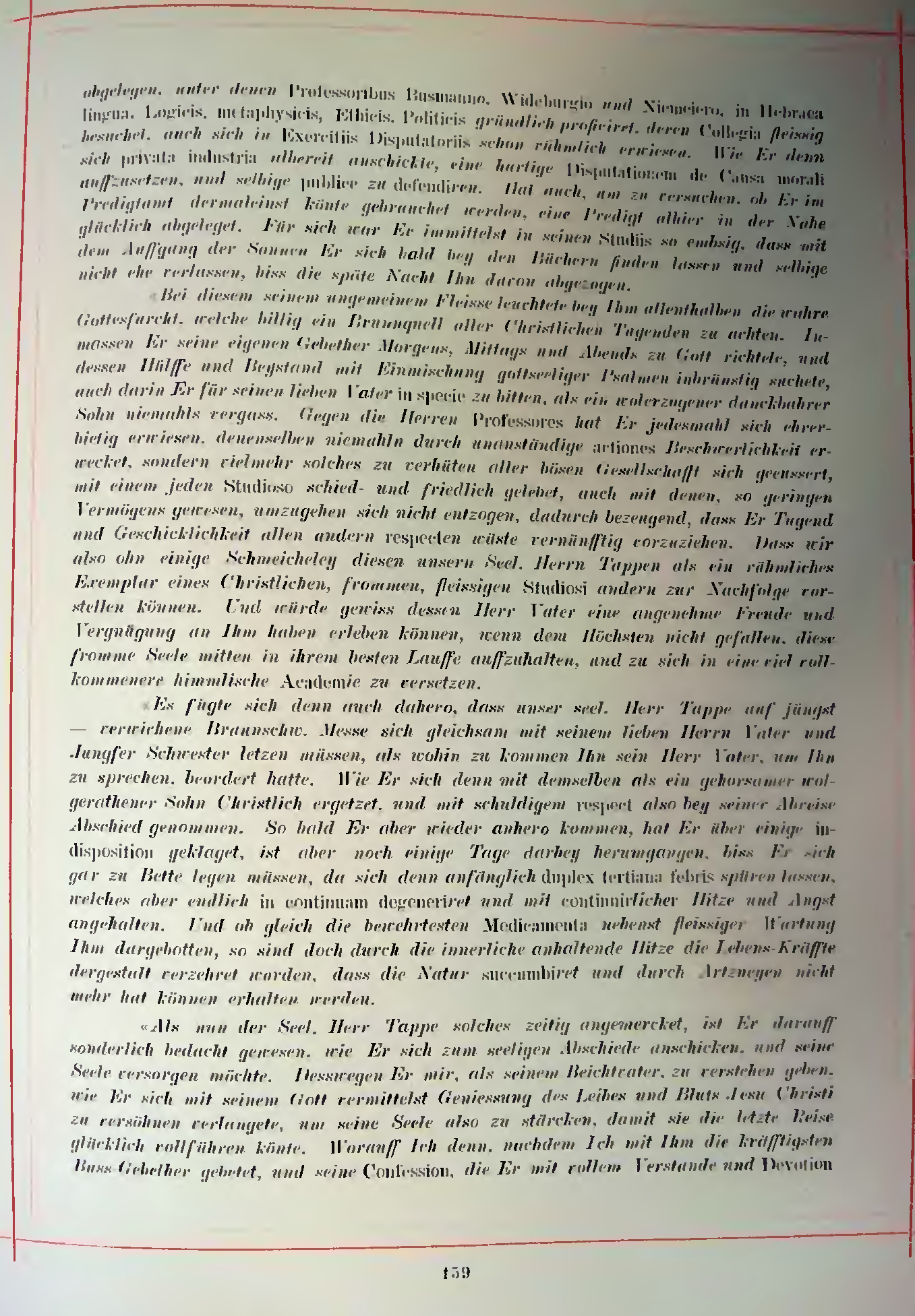 Es fügte sich denn auch dahero, dass unser seel. Herr Tappe auf jüngst - verwichene Braunschw. Messe sich gleichsam mit seinem lieben Herrn Vater und Jungfer Schwester letzen müssen, als wohin zu kommen Ihn sein Herr Vater, um Ihn zu sprechen, beordert hatte. Wie Er sich denn mit demselben als ein gehorsamer wolgerathener Sohn Christlich ergetzet, und mit schuldigem respect also bey seiner Abreise Abschied genommen. So bald Er aber wieder anhero kommen, hat Er über einige indisposition geklaget, ist aber noch einige Tage darbey herumgangen, biss Er sich gar zu Bette legen müssen, da sich denn anfänglich duplex tertiana febris spüren lassen, welches aber endlich in continuam degeneriret und mit continuirlicher Hitze und Angst angehalten. Und ob gleich die bewehrtesten Medicainenta nebenst fleissiger Wartung Ihm dargebotten, so sind doch durch die innerliche anhaltende Hitze die Lebens-Kräffte dergestalt verzehret worden, dass die Natur succumbiret und durch Artzneyen nicht mehr hat können erhalten werden.